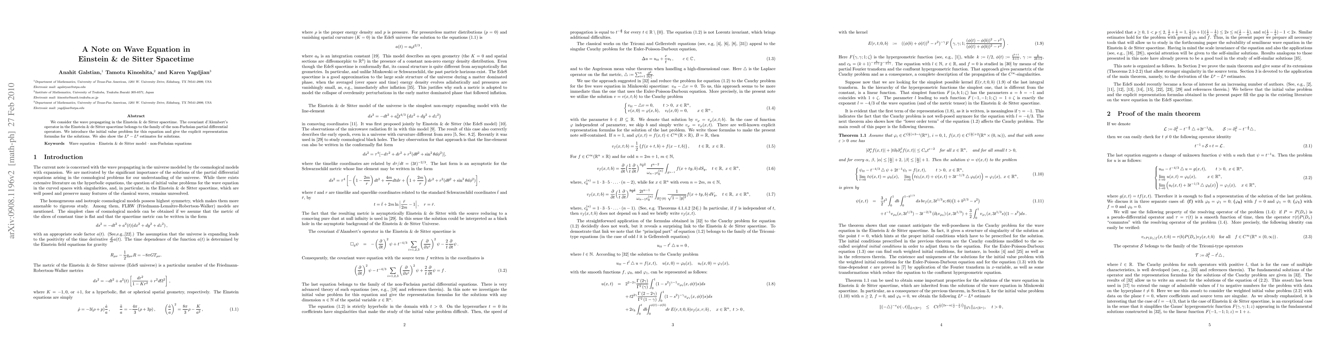 We consider the wave propagating in the Einstein & de Sitter spacetime. The covariant d'Alembert's operator in the Einstein & de Sitter spacetime belongs to the family of the non-Fuchsian partial differential operators. We introduce the initial value problem for this equation and give the explicit representation formulas for the solutions. We also show the $L^p - L^q$ estimates for solutions.