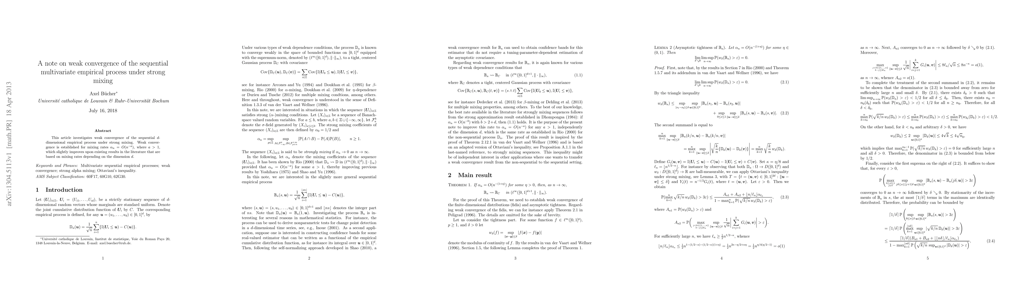 This paper establishes weak convergence of the sequential multivariate empirical process under strong mixing conditions, improving upon existing results by considering mixing rates $\alpha_n = O(n^{-a})$ with $a > 1$ independent of the dimension $d$.