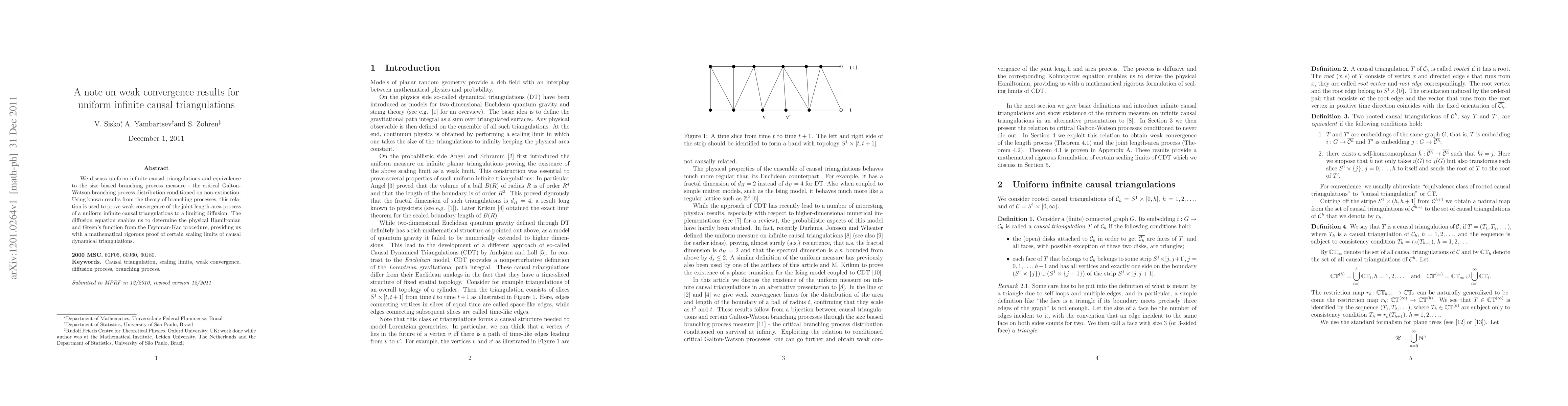 We discuss uniform infinite causal triangulations and equivalence to the size biased branching process measure - the critical Galton-Watson branching process distribution conditioned on non-extinction. Using known results from the theory of branching processes, this relation is used to prove weak convergence of the joint length-area process of a uniform infinite causal triangulations to a limiting diffusion. The diffusion equation enables us to determine the physical Hamiltonian and Green's function from the Feynman-Kac procedure, providing us with a mathematical rigorous proof of certain scaling limits of causal dynamical triangulations.