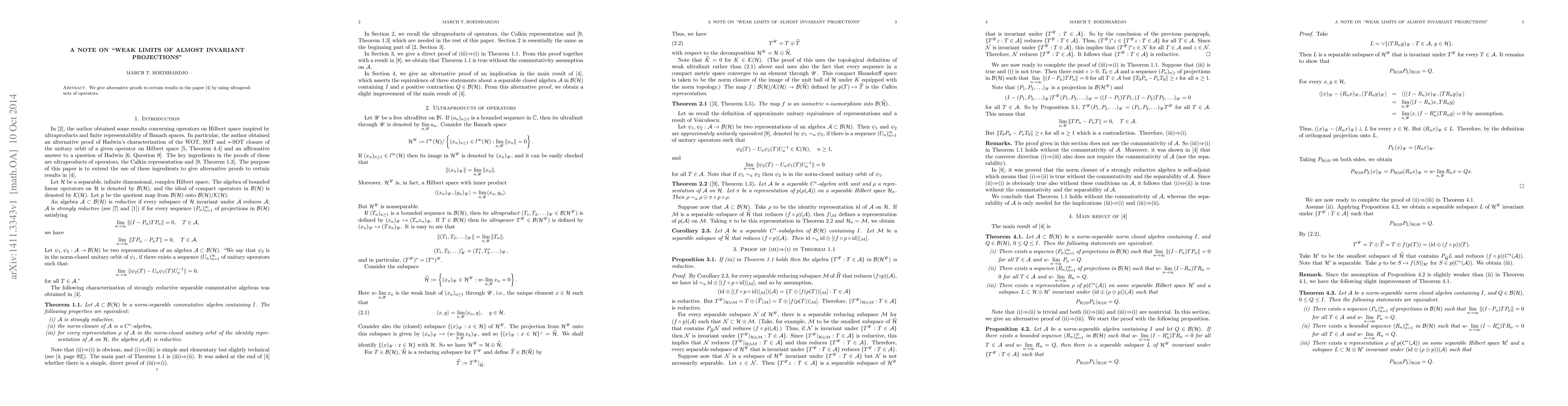 We give alternative proofs to certain results in the paper "Weak limits of almost invariant projections" by using ultraproducts of operators.