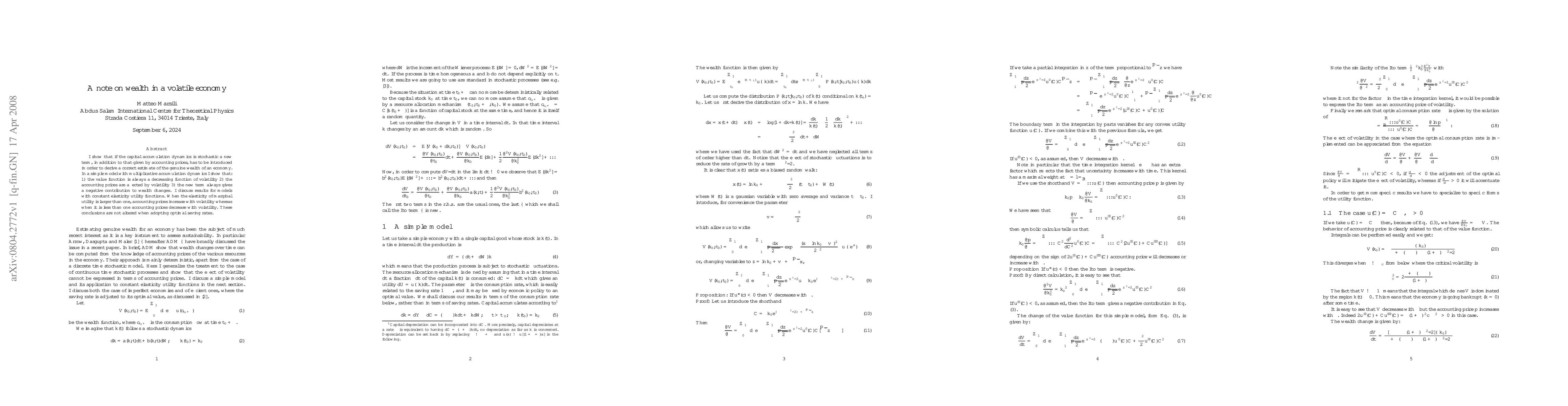I show that if the capital accumulation dynamics is stochastic a new term, in addition to that given by accounting prices, has to be introduced in order to derive a correct estimate of the genuine wealth of an economy. In a simple model with multiplicative accumulation dynamics I show that: 1) the value function is always a decreasing function of volatility 2) the accounting prices are affected by volatility 3) the new term always gives a negative contribution to wealth changes. I discuss results for models with constant elasticity utility functions. When the elasticity of marginal utility is larger than one, accounting prices increase with volatility whereas when it is less than one accounting prices decrease with volatility. These conclusions are not altered when adopting optimal saving rates.