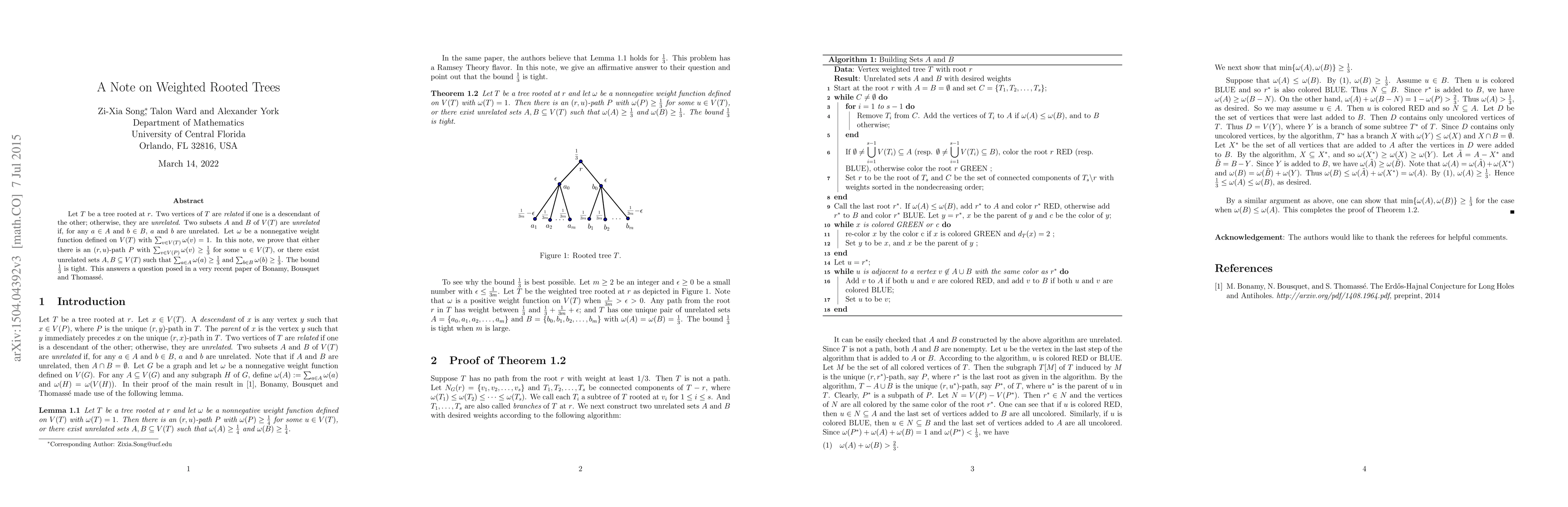 Let $T$ be a tree rooted at $r$. Two vertices of $T$ are related if one is a descendant of the other; otherwise, they are unrelated. Two subsets $A$ and $B$ of $V(T)$ are unrelated if, for any $a\in A$ and $b\in B$, $a$ and $b$ are unrelated. Let $\omega$ be a nonnegative weight function defined on $V(T)$ with $\sum_{v\in V(T)}\omega(v)=1$. In this note, we prove that either there is an $(r, u)$-path $P$ with $\sum_{v\in V(P)}\omega(v)\ge \frac13$ for some $u\in V(T)$, or there exist unrelated sets $A, B\subseteq V(T)$ such that $\sum_{a\in A }\omega(a)\ge \frac13$ and $\sum_{b\in B }\omega(b)\ge \frac13$. The bound $\frac13$ is tight. This answers a question posed in a very recent paper of Bonamy, Bousquet and Thomass\'e.