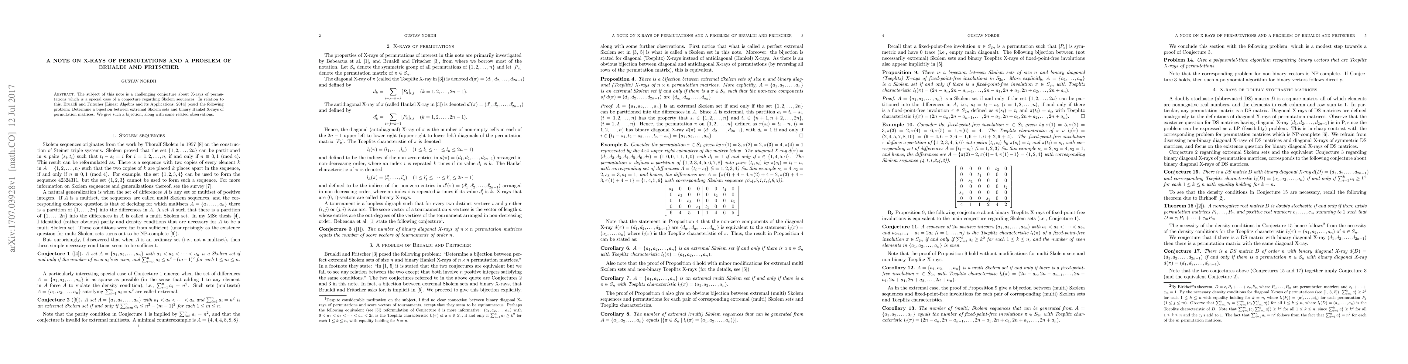 The subject of this note is a challenging conjecture about X-rays of permutations which is a special case of a conjecture regarding Skolem sequences. In relation to this, Brualdi and Fritscher [Linear Algebra and its Applications, 2014] posed the following problem: Determine a bijection between extremal Skolem sets and binary Hankel X-rays of permutation matrices. We give such a bijection, along with some related observations.