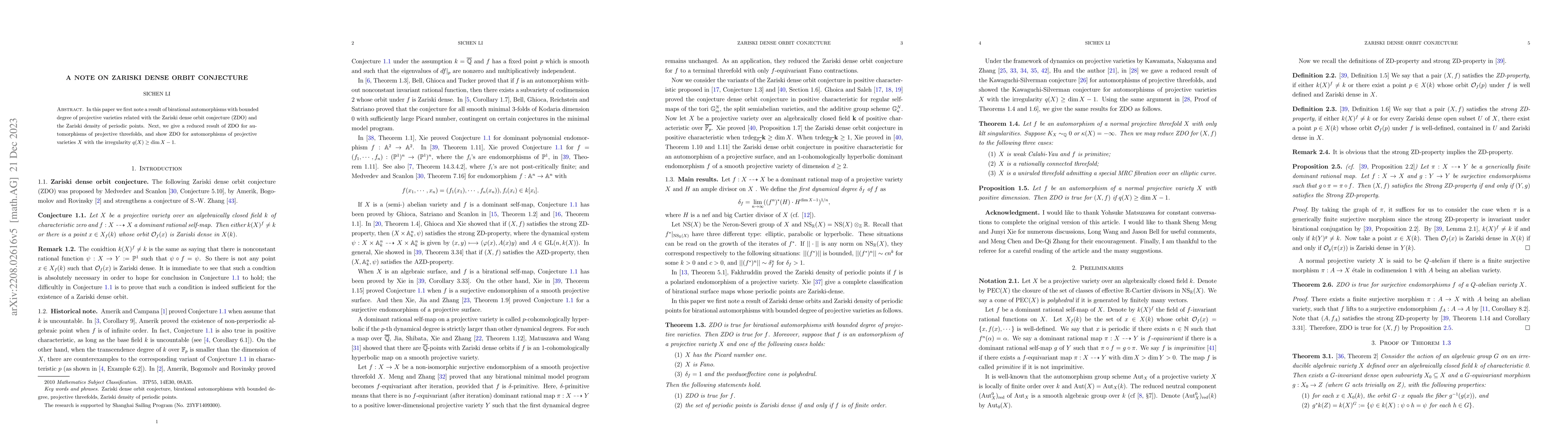 This paper demonstrates the connection between birational automorphisms of projective varieties and the Zariski dense orbit conjecture (ZDO), proving a reduced result of ZDO for projective threefolds and establishing ZDO for varieties where the irregularity exceeds the dimension minus one.