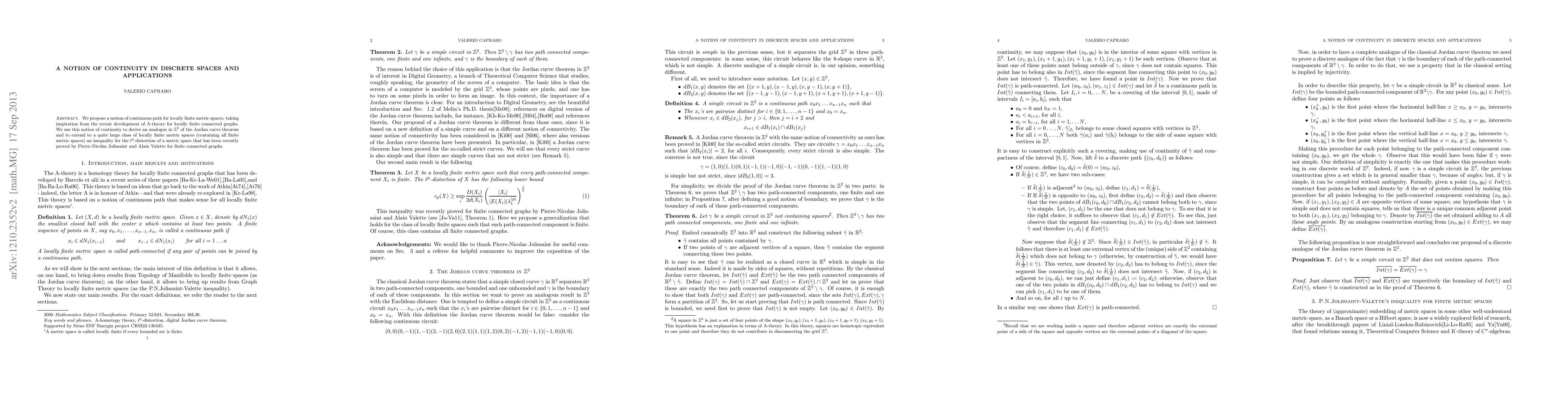 This paper introduces a novel idea of continuous paths in locally finite metric spaces, inspired by A-theory for graphs. It applies this notion to prove a version of the Jordan curve theorem in Z^2 and extends an \ell^p-distortion inequality to a broad class of locally finite metric spaces.
