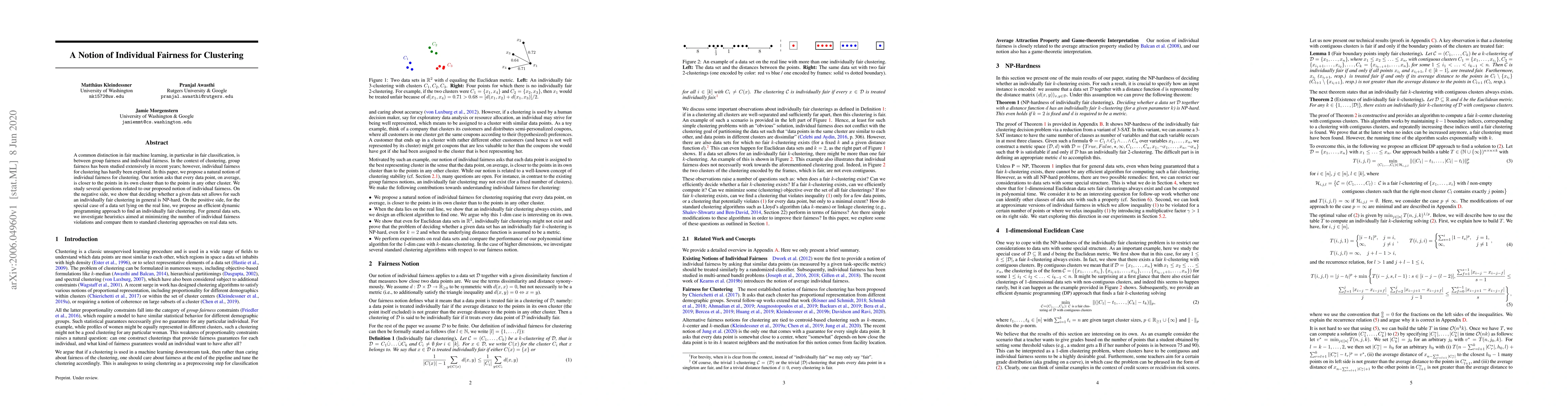This paper introduces a novel concept of individual fairness in clustering, proposing that each data point should, on average, be closer to its own cluster than to any other. It demonstrates the NP-hardness of achieving such fairness in general datasets and provides an efficient dynamic programming solution for one-dimensional data, while exploring heuristics for more complex datasets.