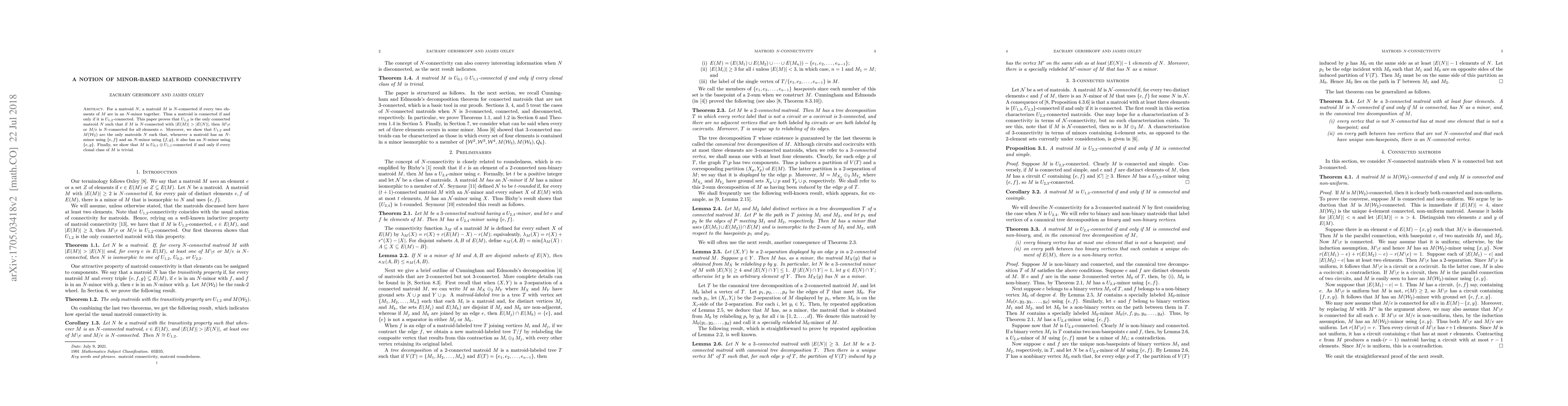 For a matroid $N$, a matroid $M$ is $N$-connected if every two elements of $M$ are in an $N$-minor together. Thus a matroid is connected if and only if it is $U_{1,2}$-connected. This paper proves that $U_{1,2}$ is the only connected matroid $N$ such that if $M$ is $N$-connected with $|E(M)| > |E(N)|$, then $M \backslash e$ or $M / e$ is $N$-connected for all elements $e$. Moreover, we show that $U_{1,2}$ and $M(\mathcal{W}_2)$ are the only connected matroids $N$ such that, whenever a matroid has an $N$-minor using $\{e,f\}$ and an $N$-minor using $\{f,g\}$, it also has an $N$-minor using $\{e,g\}$. Finally, we show that $M$ is $U_{0,1} \oplus U_{1,1}$-connected if and only if every clonal class of $M$ is trivial.