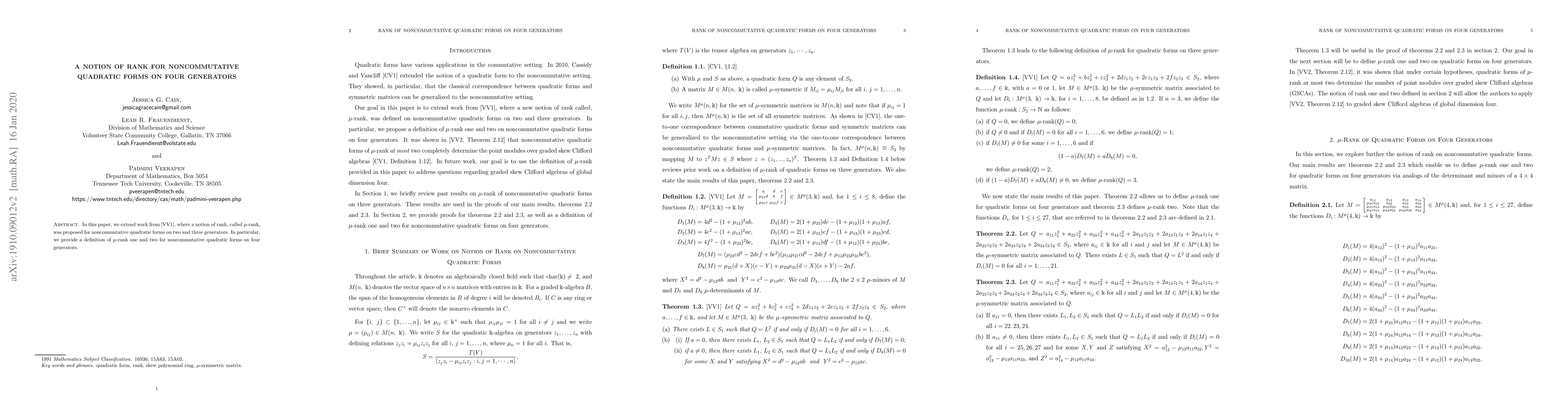 In this paper, we extend previous work, where a notion of rank, called mu-rank, was proposed for noncommutative quadratic forms on two and three generators. In particular, we provide a definition of mu-rank one and two for noncommutative quadratic forms on four generators.