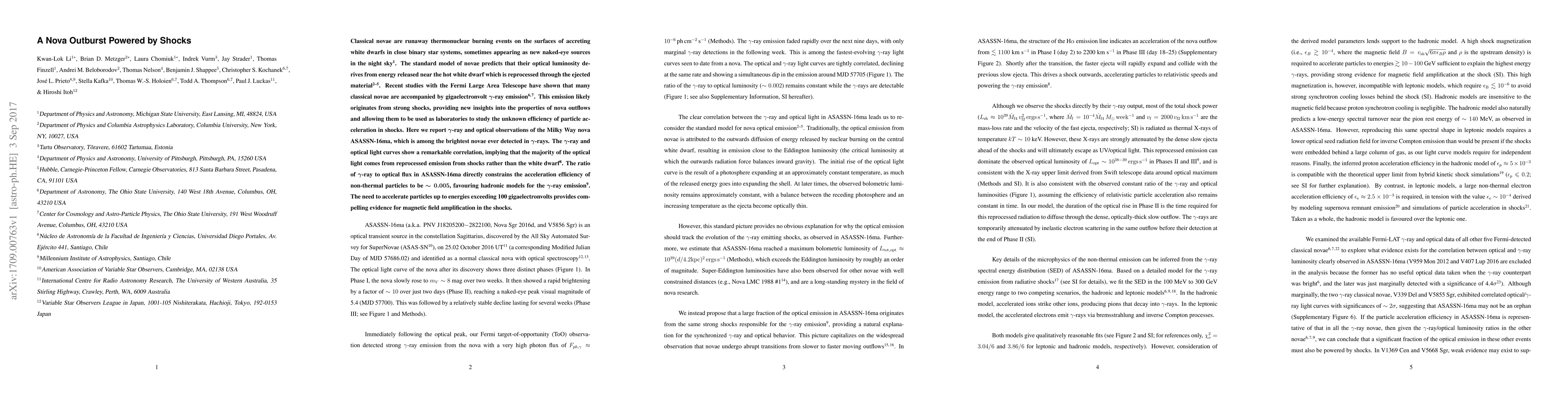 The research observes nova ASASSN-16ma, finding a strong correlation between gamma-ray and optical light curves, suggesting most optical light originates from shock-reprocessed emission rather than the white dwarf. This constrains non-thermal particle acceleration efficiency to ~0.005, favoring hadronic models for gamma-ray emission and implying magnetic field amplification in shocks.