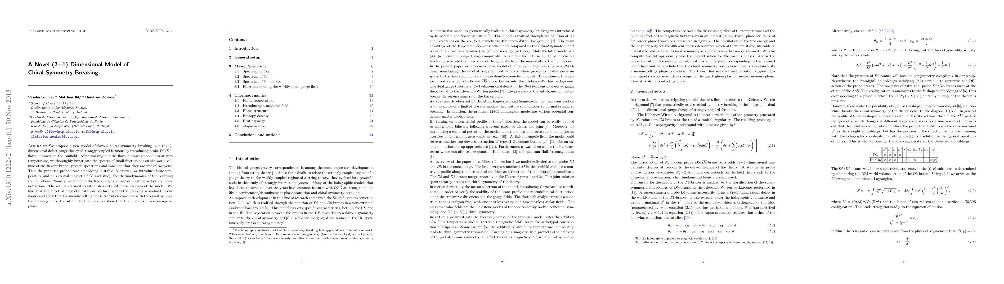 We propose a new model of flavour chiral symmetry breaking in a (2+1)-dimensional defect gauge theory of strongly coupled fermions by introducing probe D5/anti-D5-flavour branes on the conifold. After working out the flavour brane embeddings at zero temperature, we thoroughly investigate the spectra of small fluctuations on the world volume of the flavour branes (meson spectrum) and conclude that they are free of tachyons. Thus the proposed probe brane embedding is stable. Moreover, we introduce finite temperature and an external magnetic field and study the thermodynamics of the resulting configurations. Namely, we compute the free energies, entropies, heat capacities and magnetisations. The results are used to establish a detailed phase diagram of the model. We find that the effect of magnetic catalysis of chiral symmetry breaking is realised in our model and show that the meson-melting phase transition coincides with the chiral symmetry breaking phase transition. Furthermore, we show that the model is in a diamagnetic phase.