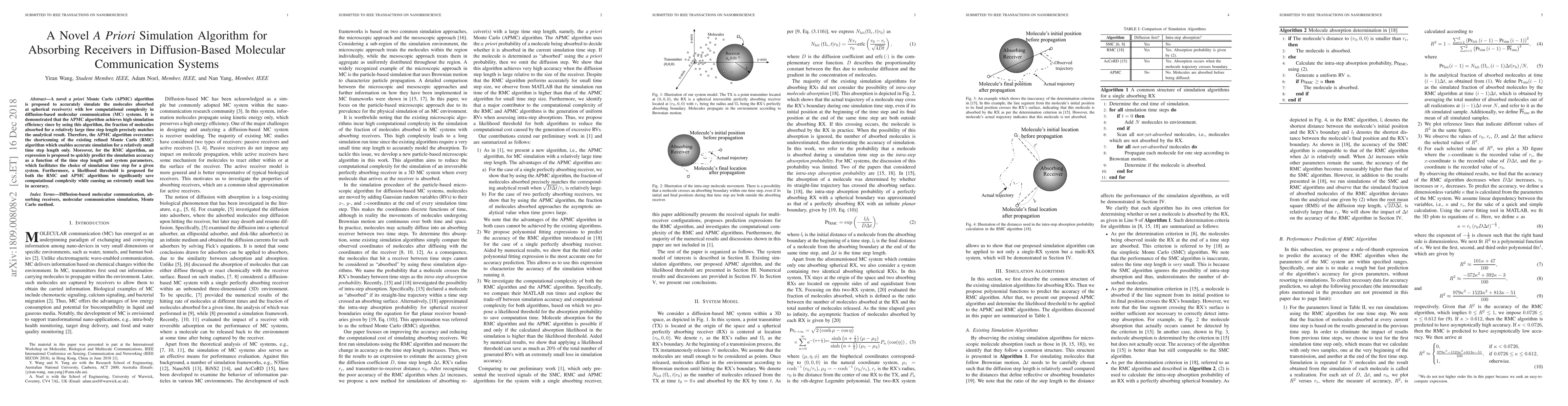 This research introduces a novel a priori Monte Carlo (APMC) algorithm for simulating molecule absorption in diffusion-based molecular communication systems. The APMC algorithm outperforms the existing refined Monte Carlo (RMC) algorithm, providing high simulation efficiency with precise absorption fraction for larger time steps. It also offers an expression to predict RMC simulation accuracy based on time step length and system parameters, and suggests a rejection threshold to reduce computational complexity without significant accuracy loss.