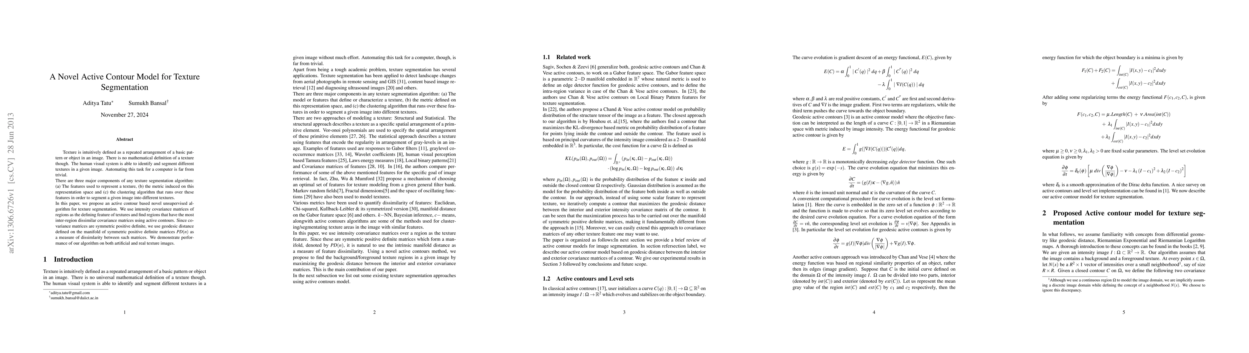 This paper proposes a novel unsupervised active contour model for texture segmentation using intensity covariance matrices as features and geodesic distance on the manifold of symmetric positive definite matrices for dissimilarity measurement. The algorithm segments images based on inter-region covariance matrix differences, demonstrating effectiveness on both artificial and real textures.