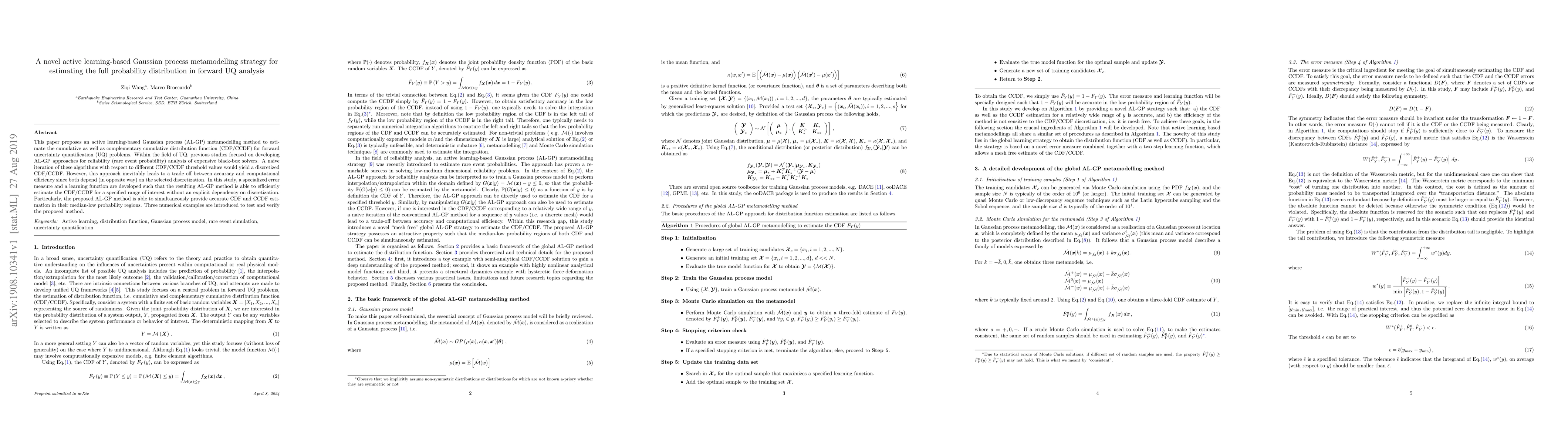 This paper introduces an active learning-based Gaussian process metamodelling strategy to estimate cumulative and complementary cumulative distribution functions for forward uncertainty quantification, overcoming the trade-off between accuracy and computational efficiency without relying on discretization. The method is validated through three numerical examples.