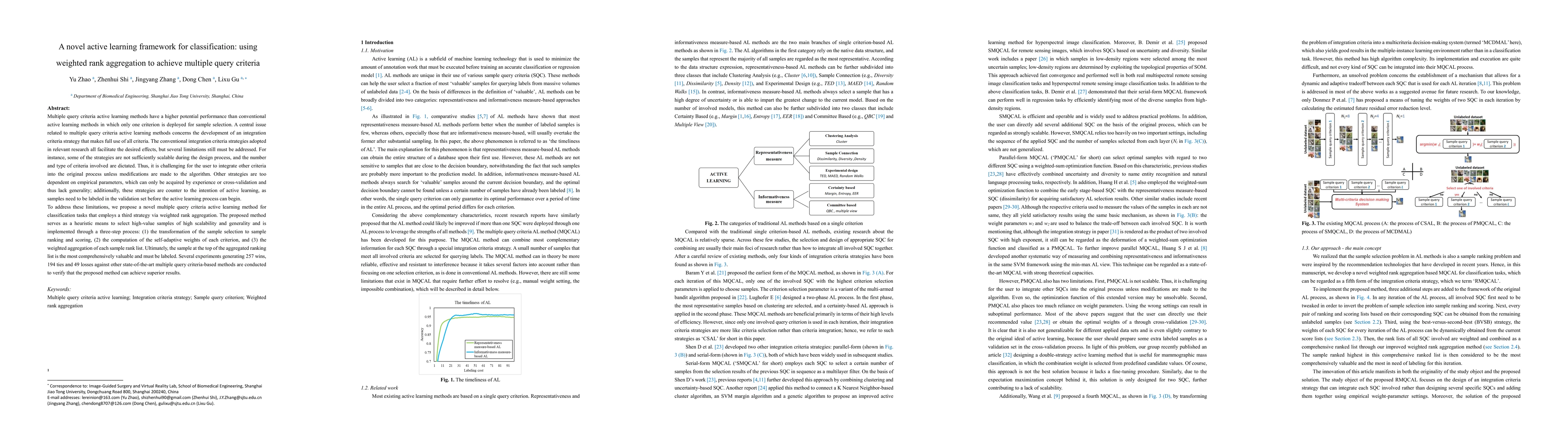 This paper proposes a novel active learning framework for classification using weighted rank aggregation to integrate multiple query criteria (MQCAL). The method aims to overcome scalability and generality issues of existing ICS strategies, offering a scalable, general, and heuristic approach for selecting high-value samples through a three-step process: sample ranking, adaptive weight computation, and weighted rank aggregation. Experimental results show superior performance compared to other state-of-the-art MQCAL methods.