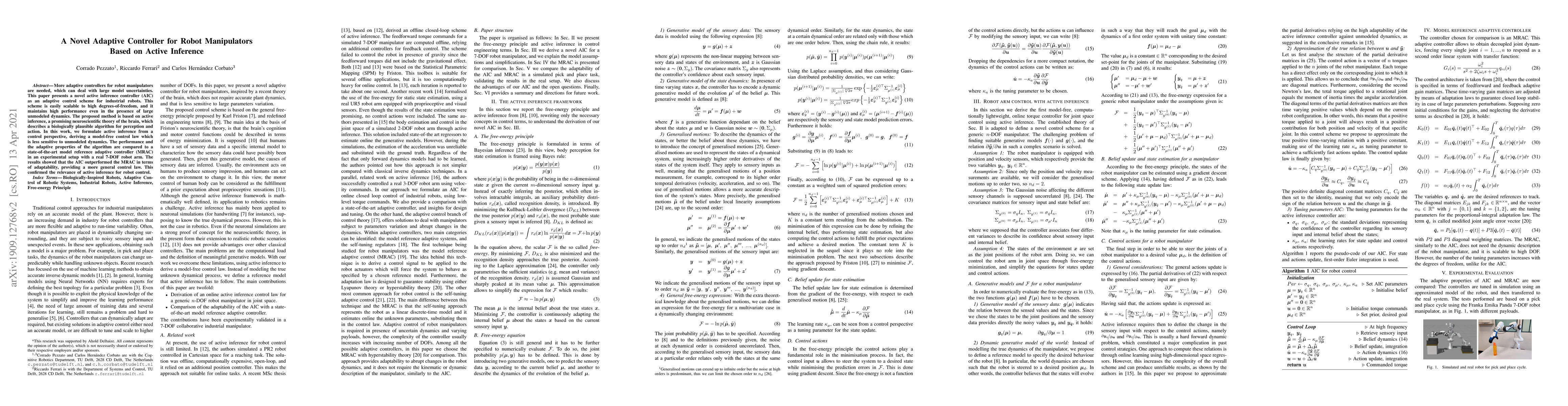 This paper introduces a novel adaptive controller based on active inference for robot manipulators, demonstrating superior adaptability and performance over a model reference adaptive controller in experiments with a 7-DOF robot arm. The proposed active inference controller is scalable and robust to large unmodeled dynamics.