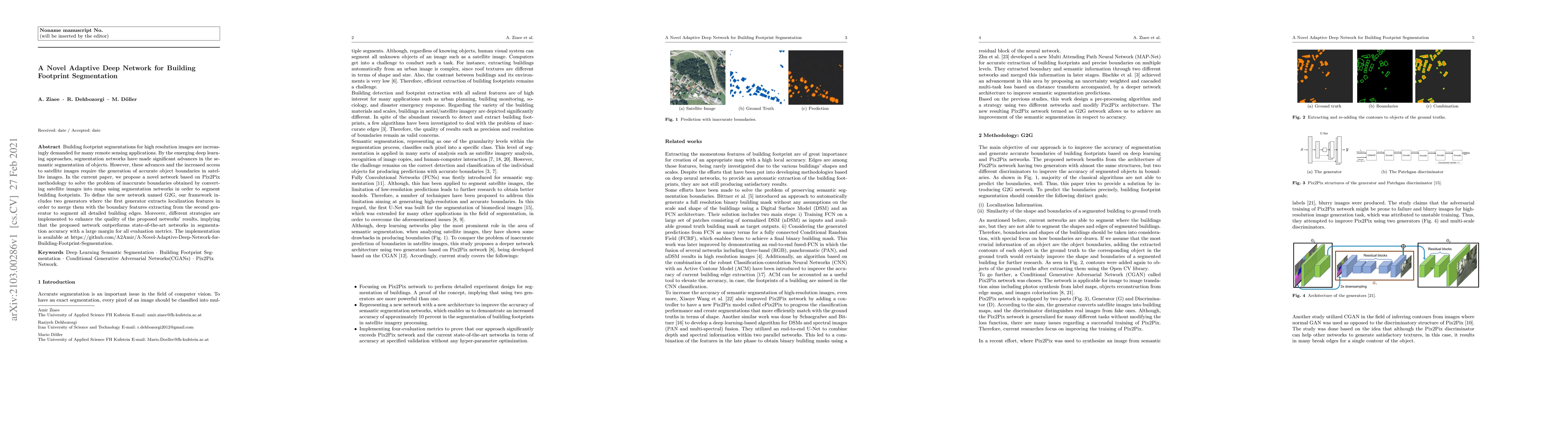 Building footprint segmentations for high resolution images are increasingly demanded for many remote sensing applications. By the emerging deep learning approaches, segmentation networks have made significant advances in the semantic segmentation of objects. However, these advances and the increased access to satellite images require the generation of accurate object boundaries in satellite images. In the current paper, we propose a novel network-based on Pix2Pix methodology to solve the problem of inaccurate boundaries obtained by converting satellite images into maps using segmentation networks in order to segment building footprints. To define the new network named G2G, our framework includes two generators where the first generator extracts localization features in order to merge them with the boundary features extracted from the second generator to segment all detailed building edges. Moreover, different strategies are implemented to enhance the quality of the proposed networks' results, implying that the proposed network outperforms state-of-the-art networks in segmentation accuracy with a large margin for all evaluation metrics. The implementation is available at https://github.com/A2Amir/A-Novel-Adaptive-Deep-Network-for-Building-Footprint-Segmentation.