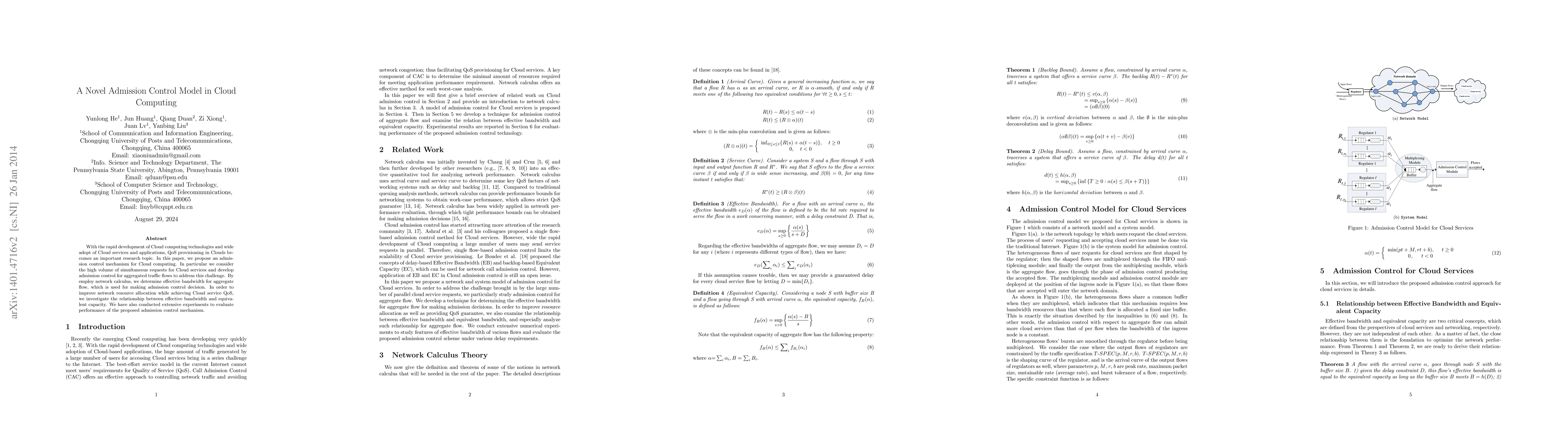This paper proposes a novel admission control mechanism for cloud computing to manage high volumes of simultaneous service requests. It uses network calculus to determine effective bandwidth for aggregated traffic flows, aiming to improve network resource allocation and maintain QoS.