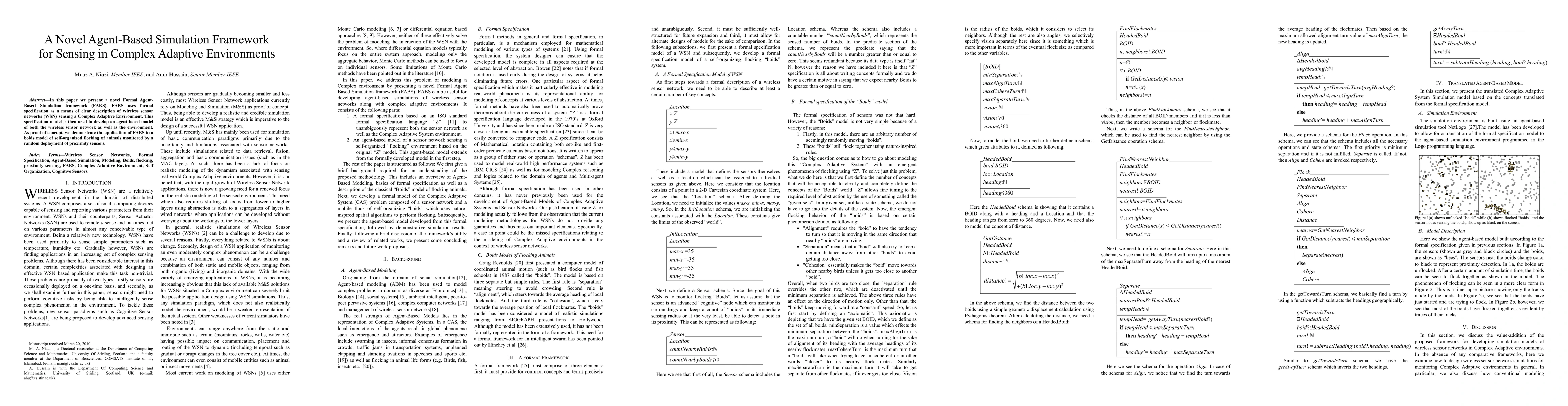 This paper introduces a novel Formal Agent-Based Simulation (FABS) framework for modeling wireless sensor networks in complex adaptive environments. The framework uses formal specifications to develop an agent-based model, demonstrated through a boids model of animal flocking monitored by sensors.