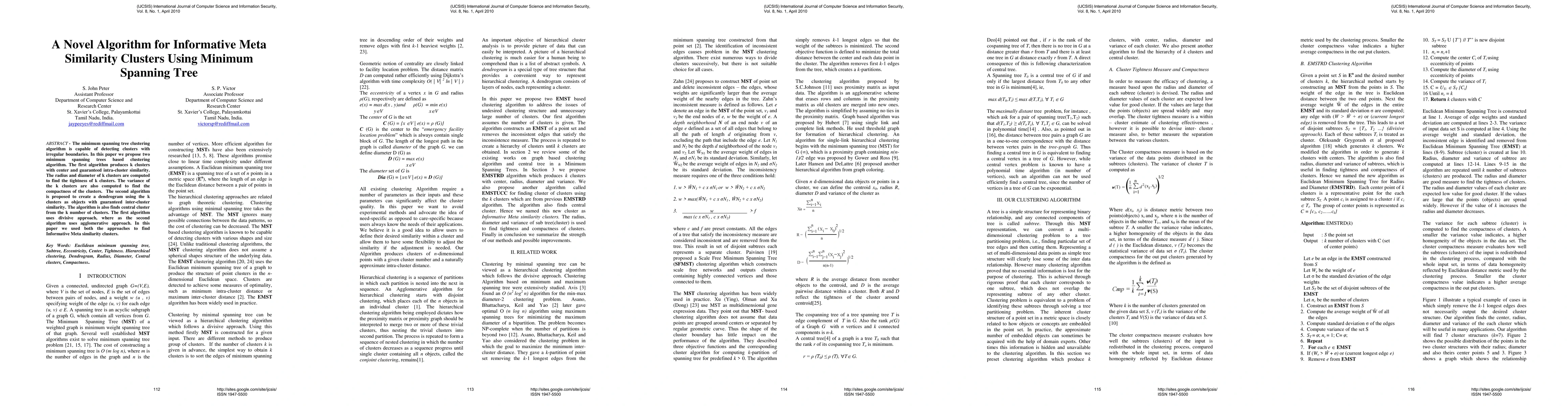 The minimum spanning tree clustering algorithm is capable of detecting clusters with irregular boundaries. In this paper we propose two minimum spanning trees based clustering algorithm. The first algorithm produces k clusters with center and guaranteed intra-cluster similarity. The radius and diameter of k clusters are computed to find the tightness of k clusters. The variance of the k clusters are also computed to find the compactness of the clusters. The second algorithm is proposed to create a dendrogram using the k clusters as objects with guaranteed inter-cluster similarity. The algorithm is also finds central cluster from the k number of clusters. The first algorithm uses divisive approach, where as the second algorithm uses agglomerative approach. In this paper we used both the approaches to find Informative Meta similarity clusters.