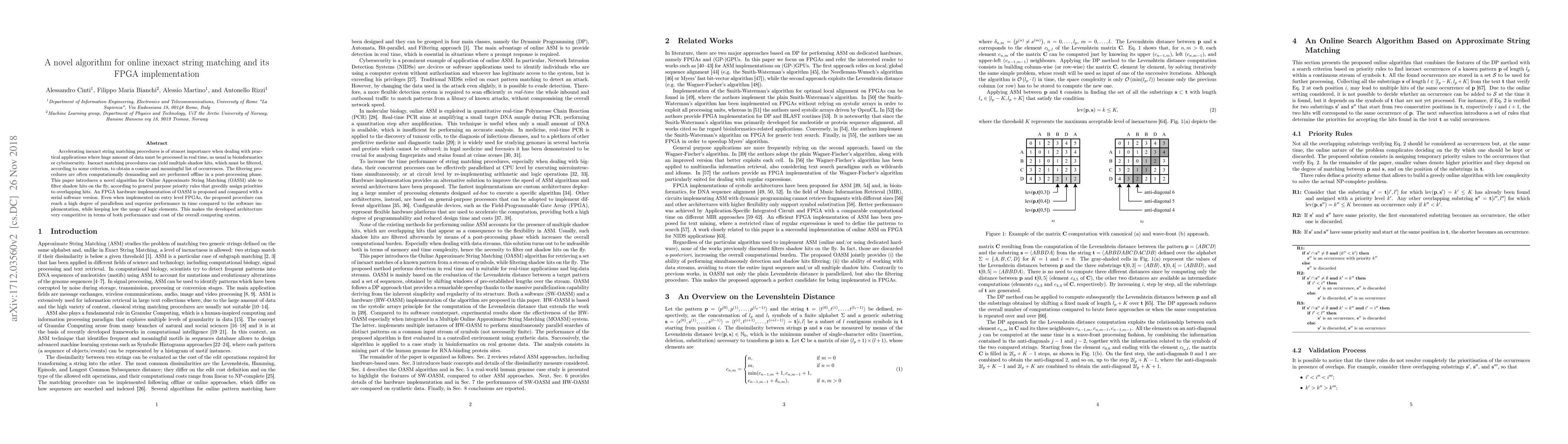 Accelerating inexact string matching procedures is of utmost importance when dealing with practical applications where huge amount of data must be processed in real time, as usual in bioinformatics or cybersecurity. Inexact matching procedures can yield multiple shadow hits, which must be filtered, according to some criterion, to obtain a concise and meaningful list of occurrences. The filtering procedures are often computationally demanding and are performed offline in a post-processing phase. This paper introduces a novel algorithm for Online Approximate String Matching (OASM) able to filter shadow hits on the fly, according to general purpose priority rules that greedily assign priorities to overlapping hits. An FPGA hardware implementation of OASM is proposed and compared with a serial software version. Even when implemented on entry level FPGAs, the proposed procedure can reach a high degree of parallelism and superior performance in time compared to the software implementation, while keeping low the usage of logic elements. This makes the developed architecture very competitive in terms of both performance and cost of the overall computing system.