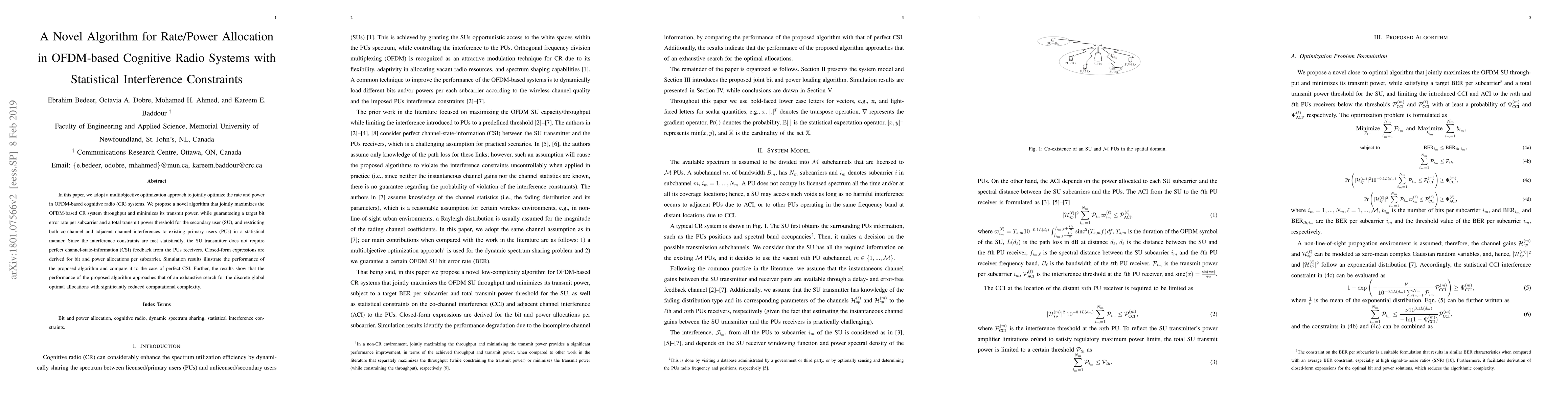 This paper proposes a novel algorithm for optimizing rate and power in OFDM-based cognitive radio systems, aiming to maximize throughput while minimizing power and ensuring statistical interference constraints for primary users. The algorithm achieves this without requiring perfect channel-state-information feedback, demonstrating comparable performance to exhaustive search with lower computational complexity.