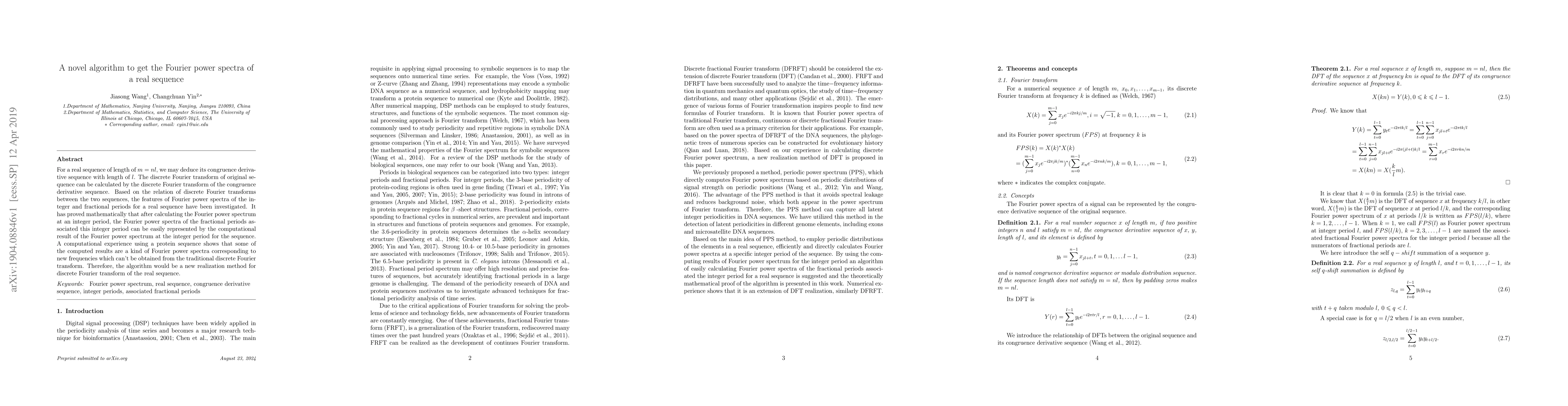 For a real sequence of length of m = nl, we may deduce its congruence derivative sequence with length of l. The discrete Fourier transform of original sequence can be calculated by the discrete Fourier transform of the congruence derivative sequence. Based on the relation of discrete Fourier transforms between the two sequences, the features of Fourier power spectra of the integer and fractional periods for a real sequence have been investigated. It has proved mathematically that after calculating the Fourier power spectrum at an integer period, the Fourier power spectra of the fractional periods associated this integer period can be easily represented by the computational result of the Fourier power spectrum at the integer period for the sequence. A computational experience using a protein sequence shows that some of the computed results are a kind of Fourier power spectra corresponding to new frequencies which can't be obtained from the traditional discrete Fourier transform. Therefore, the algorithm would be a new realization method for discrete Fourier transform of the real sequence.