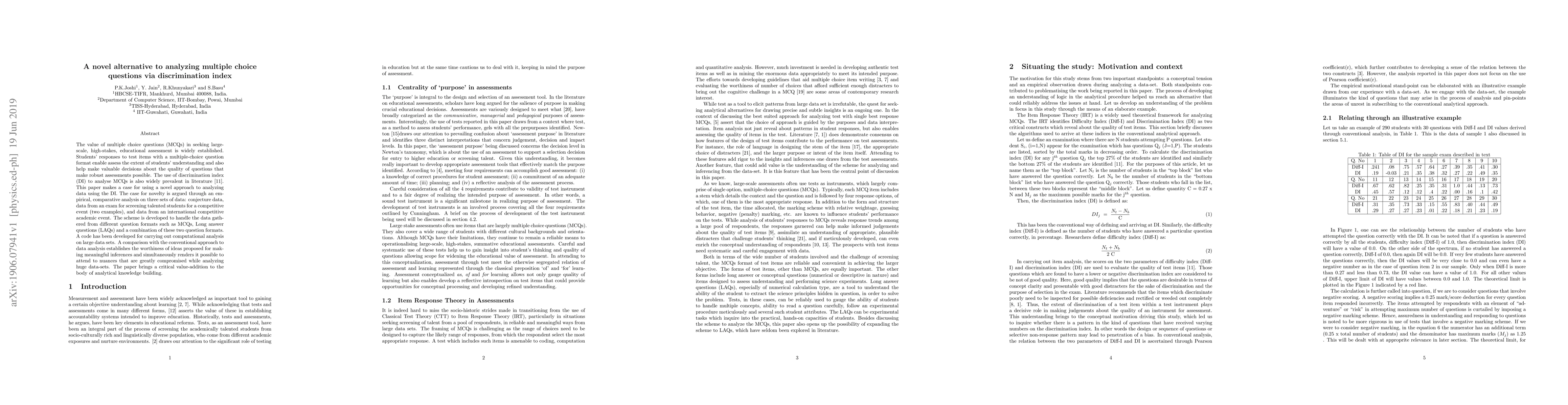 The value of multiple choice questions (MCQs) in seeking large-scale, high-stakes, educational assessment is widely established. Students' responses to test items with a multiple-choice question format enable assess the extent of students' understanding and also help make valuable decisions about the quality of questions that make robust assessments possible. The use of discrimination index (DI) to analyse MCQs is also widely prevalent in literature Kelly(1939). This paper makes a case for using a novel approach to analyzing data using the DI. The case for novelty is argued through an empirical, comparative analysis on three sets of data: conjecture data, data from an exam for screening talented students for a competitive event (two examples), and data from an international competitive academic event. The scheme is developed to handle the data gathered from different question formats such as MCQs, Long answer questions (LAQs) and a combination of these two question formats. A code has been developed for carrying out computational analysis on large data sets. A comparison with the conventional approach to data analysis establishes the worthiness of ideas proposed for making meaningful inferences and simultaneously renders it possible to attend to nuances that are greatly compromised while analyzing huge data-sets. The paper brings a critical value-addition to the body of analytical knowledge building.