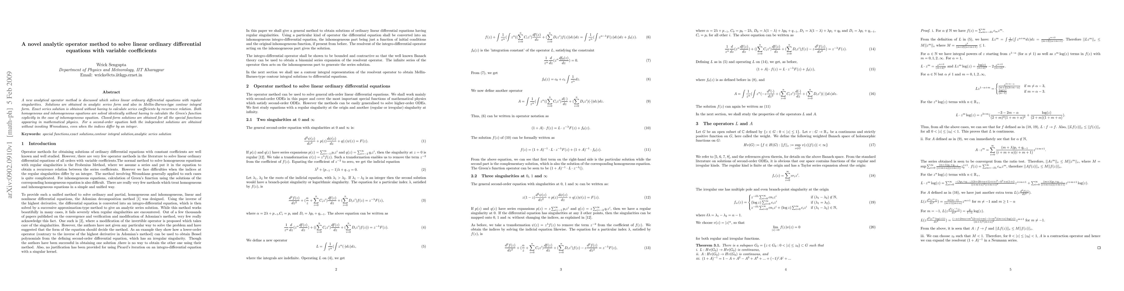 This paper introduces a novel analytical operator method for solving linear ordinary differential equations with variable coefficients, offering exact series solutions and Mellin-Barnes-type contour integrals without calculating coefficients or Green's functions, and providing closed-form solutions for special functions in mathematical physics.
