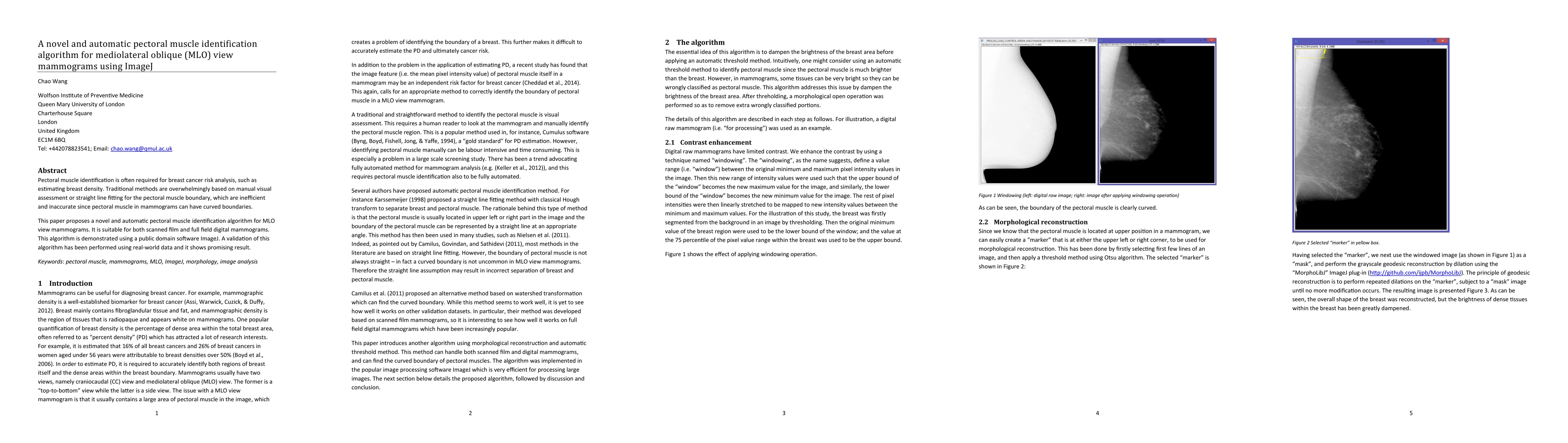Pectoral muscle identification is often required for breast cancer risk analysis, such as estimating breast density. Traditional methods are overwhelmingly based on manual visual assessment or straight line fitting for the pectoral muscle boundary, which are inefficient and inaccurate since pectoral muscle in mammograms can have curved boundaries. This paper proposes a novel and automatic pectoral muscle identification algorithm for MLO view mammograms. It is suitable for both scanned film and full field digital mammograms. This algorithm is demonstrated using a public domain software ImageJ. A validation of this algorithm has been performed using real-world data and it shows promising result.