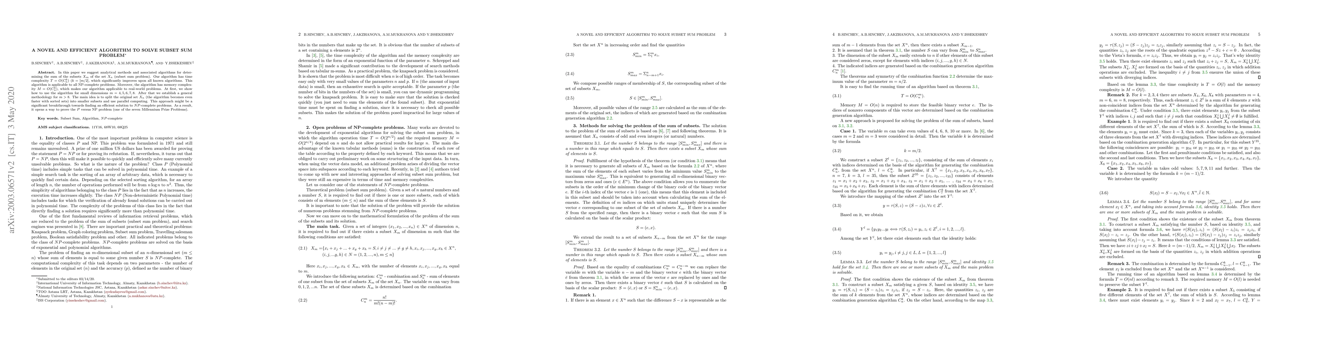 A new algorithm solves subset sum problems in O(C_n^k) time complexity, offering a breakthrough for solving NP-complete problems and potentially resolving the P versus NP problem.