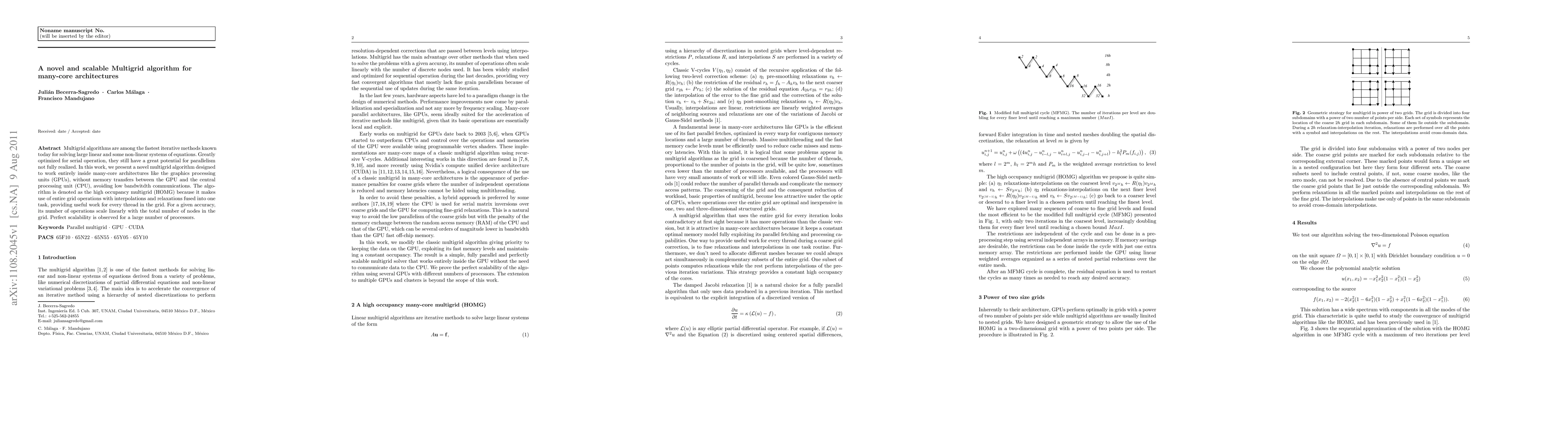 Researchers developed a novel multigrid algorithm that maximizes parallelism on many-core architectures like GPUs, achieving perfect scalability for large numbers of processors. The 'High Occupancy Multigrid' (HOMG) algorithm scales linearly with the number of nodes in the grid, making it faster and more efficient.