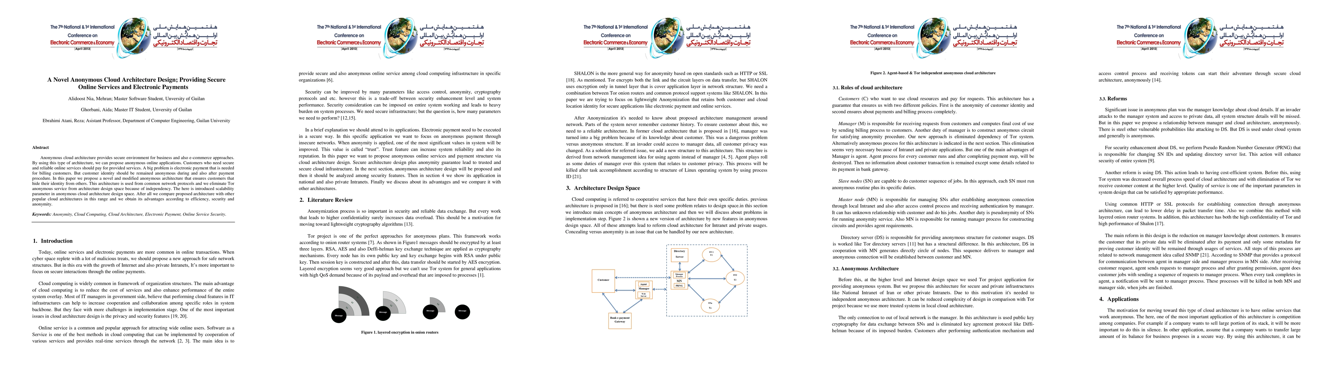 This paper proposes a novel anonymous cloud architecture for secure online services and electronic payments, ensuring customer anonymity throughout the payment process. The architecture leverages common network protocols and introduces a scalability parameter, demonstrating advantages over other popular cloud architectures in terms of efficiency, security, and anonymity.