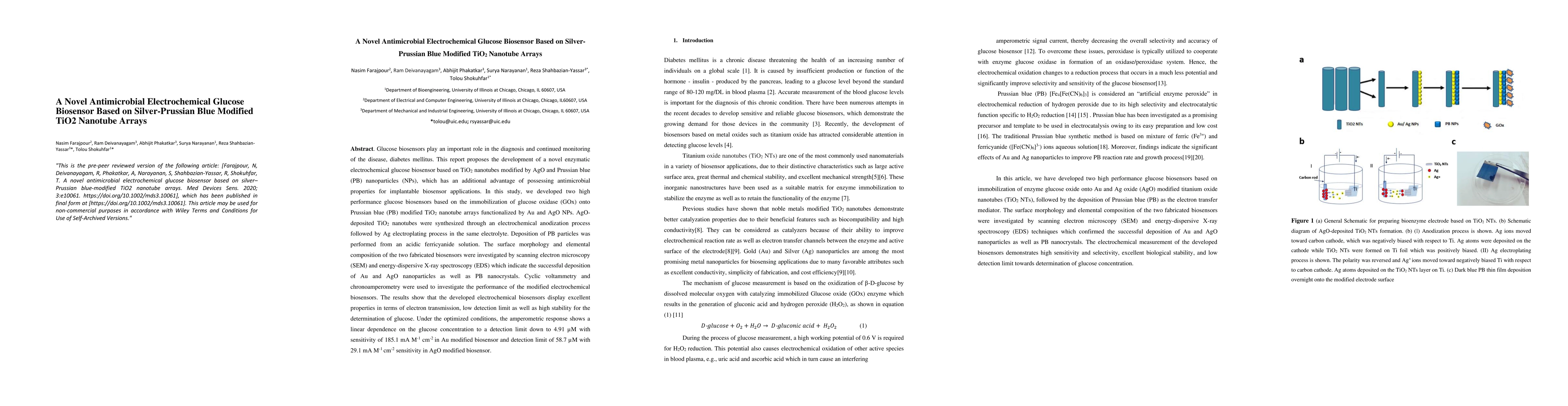 A novel glucose biosensor was developed using silver-prussian blue modified TiO2 nanotube arrays, which also exhibit antimicrobial properties, with promising results including low detection limits and high stability.