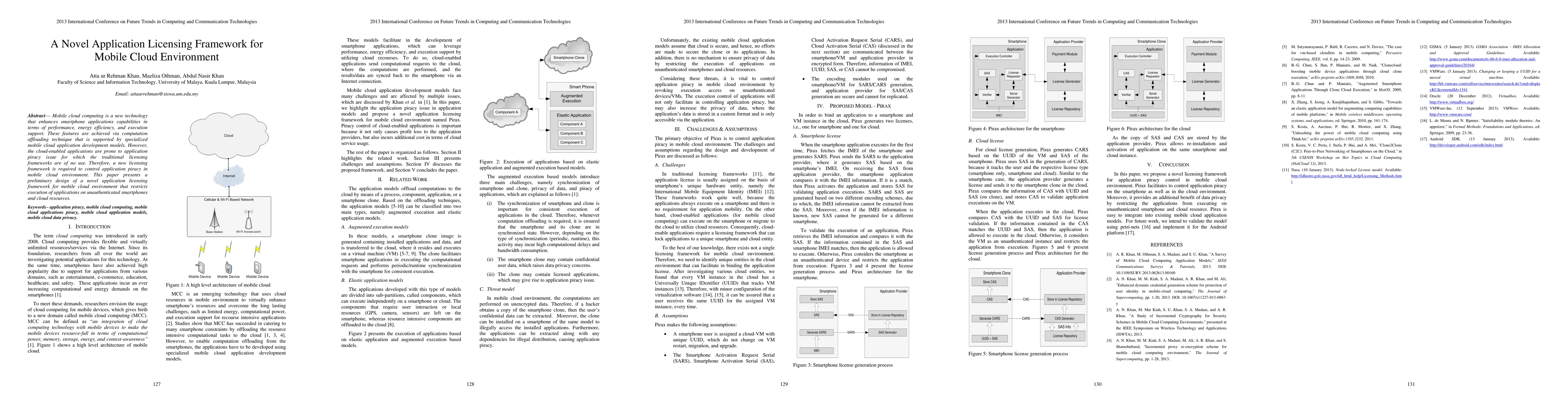 This paper proposes a novel licensing framework to address the piracy issue in mobile cloud computing by restricting application execution on unauthenticated devices and cloud resources, leveraging specialized mobile cloud application development models. The framework aims to enhance performance, energy efficiency, and security in cloud-enabled applications.