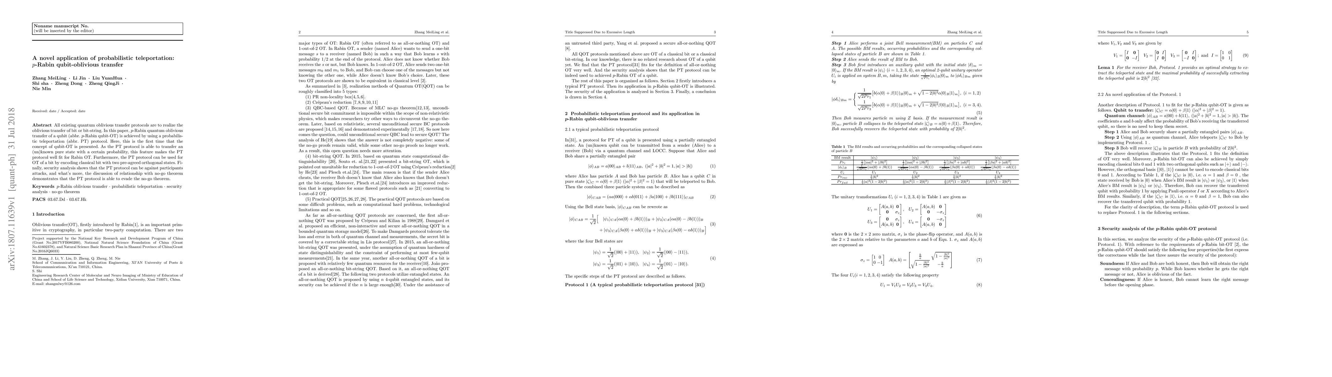 This paper introduces a novel p-Rabin quantum oblivious transfer protocol using probabilistic teleportation to transfer a qubit, marking the first application of qubit-OT. The protocol is shown to be secure against participant attacks and can circumvent the no-go theorem.