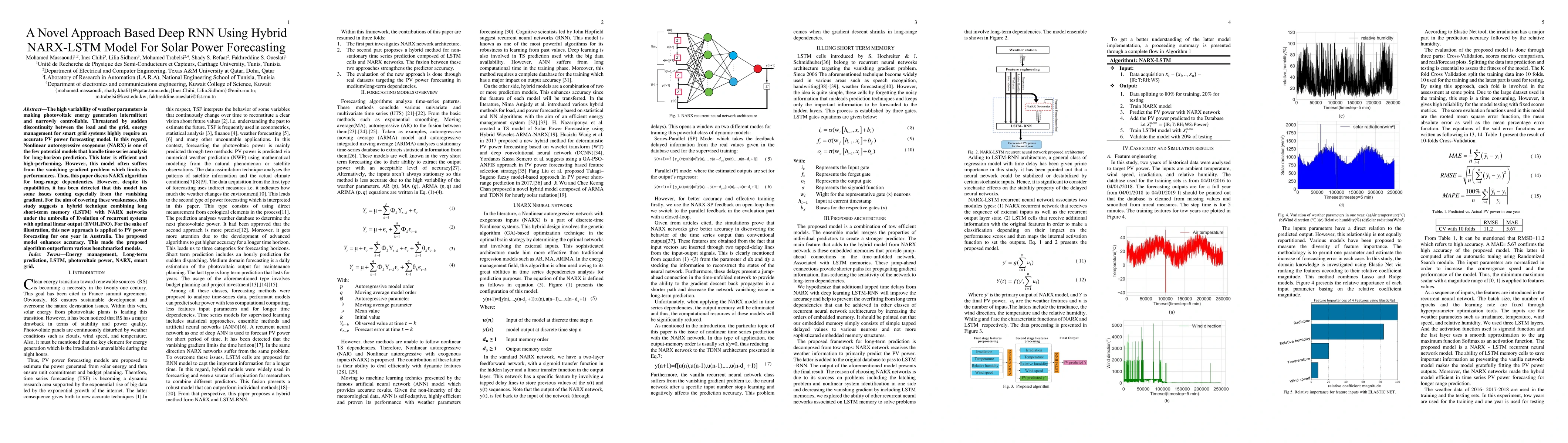 The high variability of weather parameters is making photovoltaic energy generation intermittent and narrowly controllable. Threatened by the sudden discontinuity between the load and the grid, energy management for smart grid systems highly require an accurate PV power forecasting model. In this regard, Nonlinear autoregressive exogenous (NARX) is one of the few potential models that handle time series analysis for long-horizon prediction. This later is efficient and high-performing. However, this model often suffers from the vanishing gradient problem which limits its performances. Thus, this paper discus NARX algorithm for long-range dependencies. However, despite its capabilities, it has been detected that this model has some issues coming especially from the vanishing gradient. For the aim of covering these weaknesses, this study suggests a hybrid technique combining long short-term memory (LSTM) with NARX networks under the umbrella of Evolution of recurrent systems with optimal linear output (EVOLINO). For the sake of illustration, this new approach is applied to PV power forecasting for one year in Australia. The proposed model enhances accuracy. This made the proposed algorithm outperform various benchmarked models.