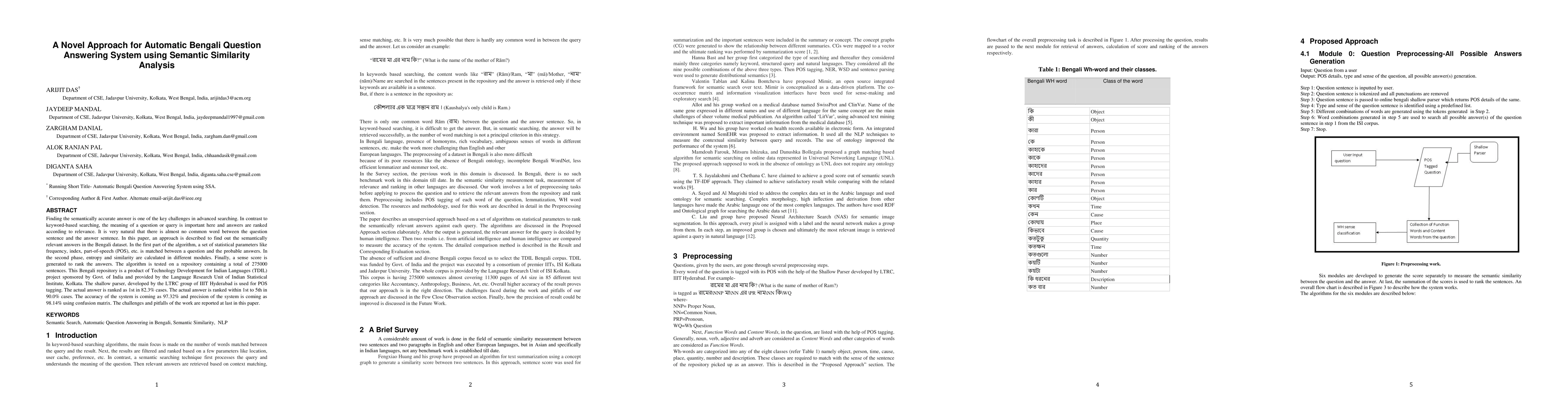Finding the semantically accurate answer is one of the key challenges in advanced searching. In contrast to keyword-based searching, the meaning of a question or query is important here and answers are ranked according to relevance. It is very natural that there is almost no common word between the question sentence and the answer sentence. In this paper, an approach is described to find out the semantically relevant answers in the Bengali dataset. In the first part of the algorithm, a set of statistical parameters like frequency, index, part-of-speech (POS), etc. is matched between a question and the probable answers. In the second phase, entropy and similarity are calculated in different modules. Finally, a sense score is generated to rank the answers. The algorithm is tested on a repository containing a total of 275000 sentences. This Bengali repository is a product of Technology Development for Indian Languages (TDIL) project sponsored by Govt. of India and provided by the Language Research Unit of Indian Statistical Institute, Kolkata. The shallow parser, developed by the LTRC group of IIIT Hyderabad is used for POS tagging. The actual answer is ranked as 1st in 82.3% cases. The actual answer is ranked within 1st to 5th in 90.0% cases. The accuracy of the system is coming as 97.32% and precision of the system is coming as 98.14% using confusion matrix. The challenges and pitfalls of the work are reported at last in this paper.