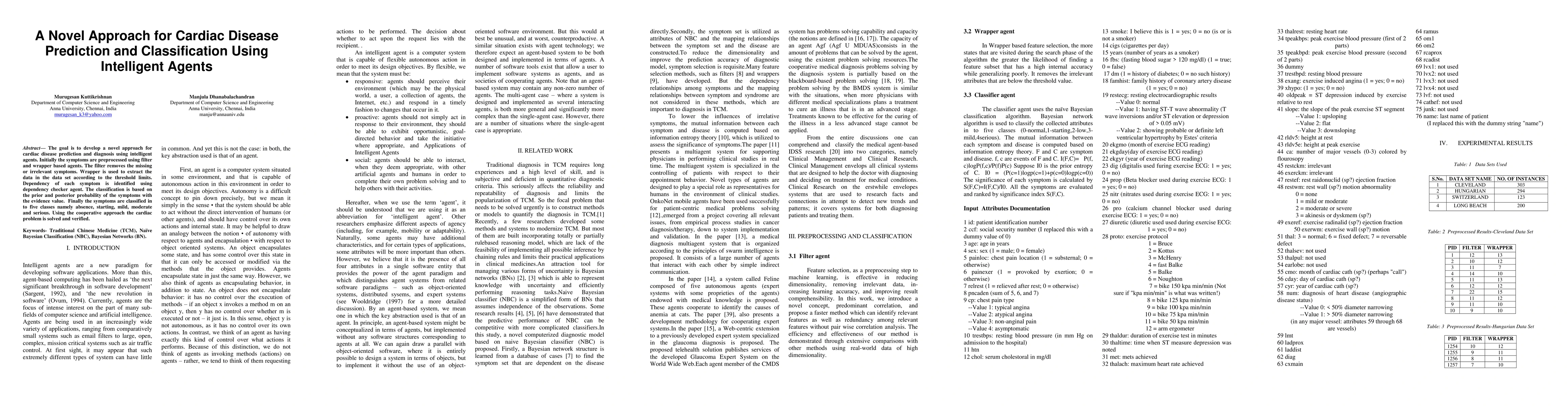 This paper proposes a novel approach to predicting and classifying cardiac disease using intelligent agents, which preprocess symptoms, extract relevant data, and classify into five severity levels.