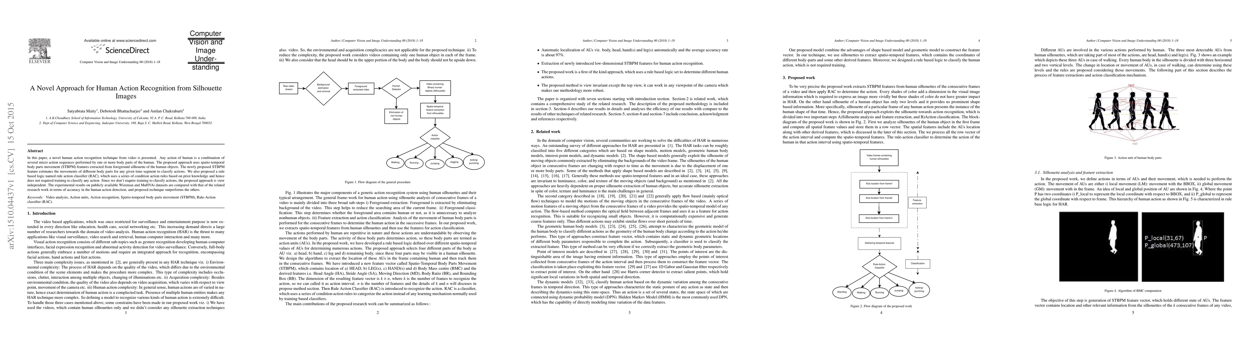 In this paper, a novel human action recognition technique from video is presented. Any action of human is a combination of several micro action sequences performed by one or more body parts of the human. The proposed approach uses spatio-temporal body parts movement (STBPM) features extracted from foreground silhouette of the human objects. The newly proposed STBPM feature estimates the movements of different body parts for any given time segment to classify actions. We also proposed a rule based logic named rule action classifier (RAC), which uses a series of condition action rules based on prior knowledge and hence does not required training to classify any action. Since we don't require training to classify actions, the proposed approach is view independent. The experimental results on publicly available Wizeman and MuHVAi datasets are compared with that of the related research work in terms of accuracy in the human action detection, and proposed technique outperforms the others.