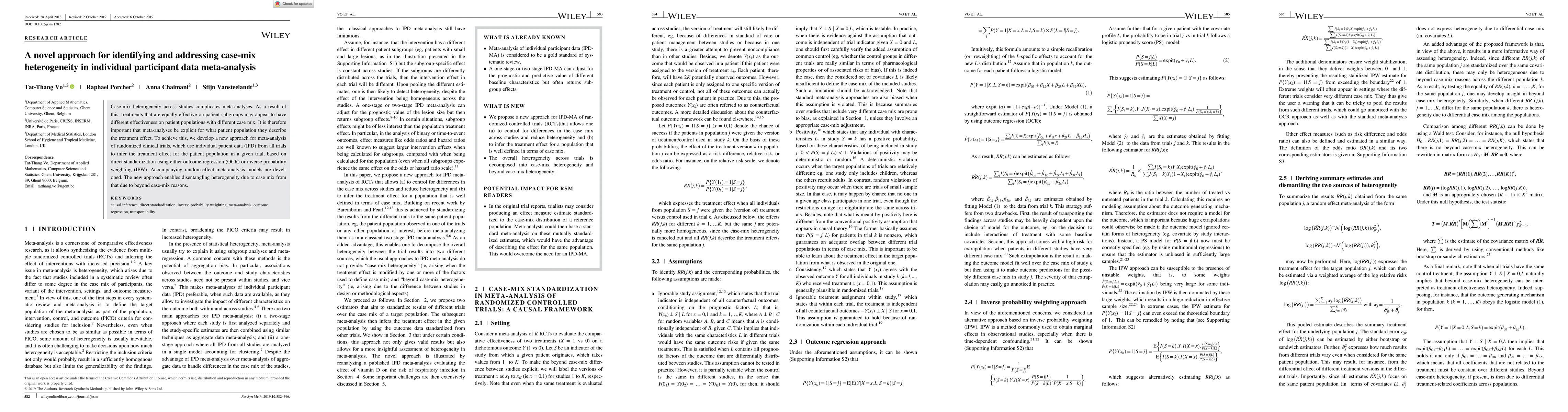 This paper introduces a novel method for addressing case-mix heterogeneity in individual participant data meta-analyses, employing direct standardization via outcome regression or inverse probability weighting to clarify treatment effects across different patient populations. The approach also includes random-effect meta-analysis models to disentangle heterogeneity due to case mix from other factors.