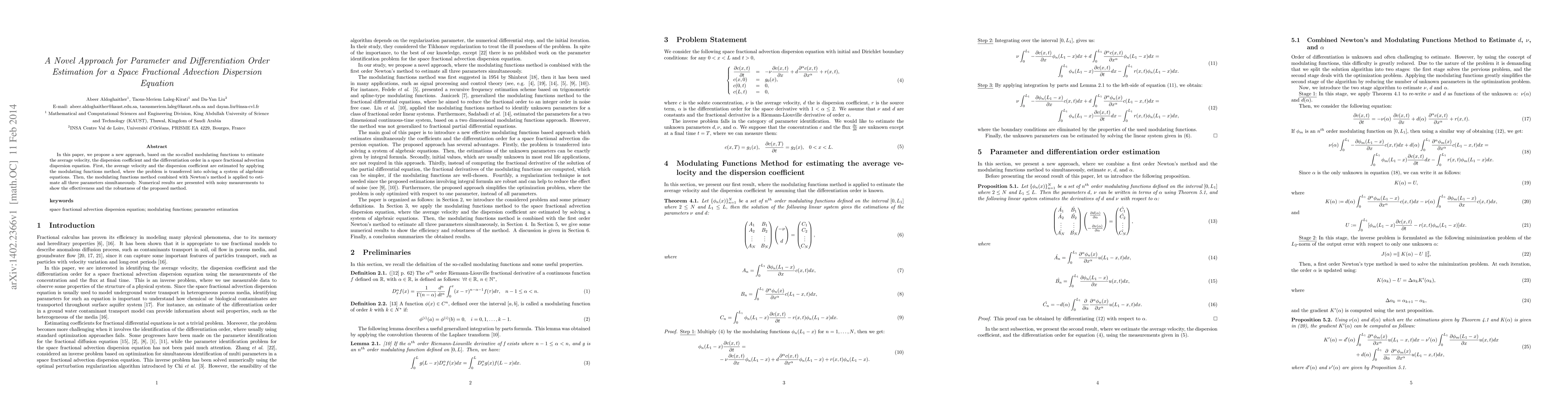 In this paper, we propose a new approach, based on the so-called modulating functions to estimate the average velocity, the dispersion coefficient and the differentiation order in a space fractional advection dispersion equation. First, the average velocity and the dispersion coefficient are estimated by applying the modulating functions method, where the problem is transferred into solving a system of algebraic equations. Then, the modulating functions method combined with Newton's method is applied to estimate all three parameters simultaneously. Numerical results are presented with noisy measurements to show the effectiveness and the robustness of the proposed method.