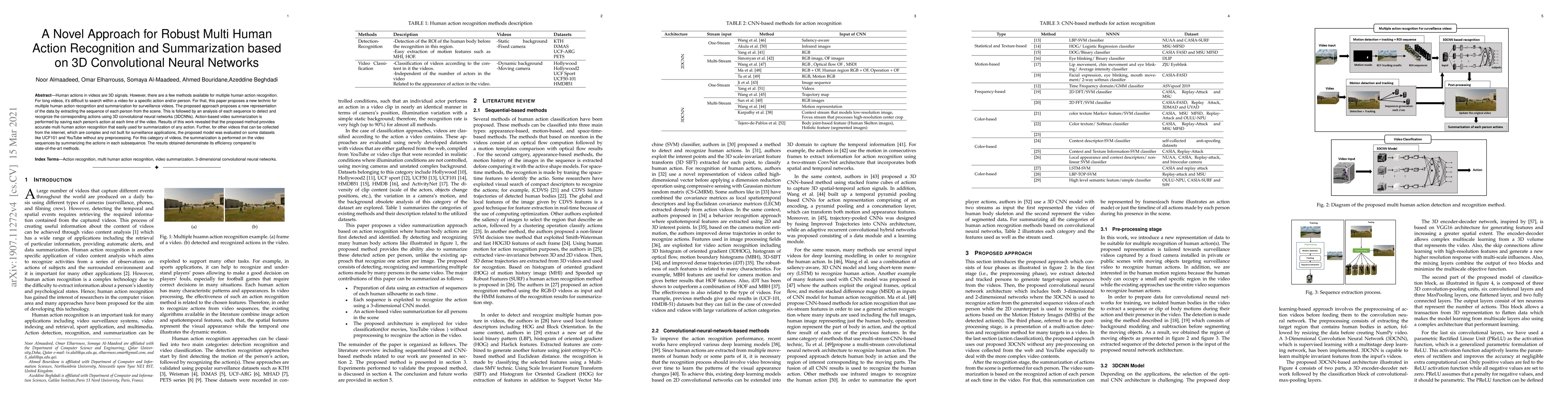 This paper introduces a novel method for robust multi-human action recognition and summarization using 3D convolutional neural networks (3DCNNs). The approach extracts individual sequences for each person in surveillance videos, detects actions using 3DCNNs, and summarizes actions for easy retrieval, outperforming state-of-the-art methods on both surveillance and non-surveillance datasets.