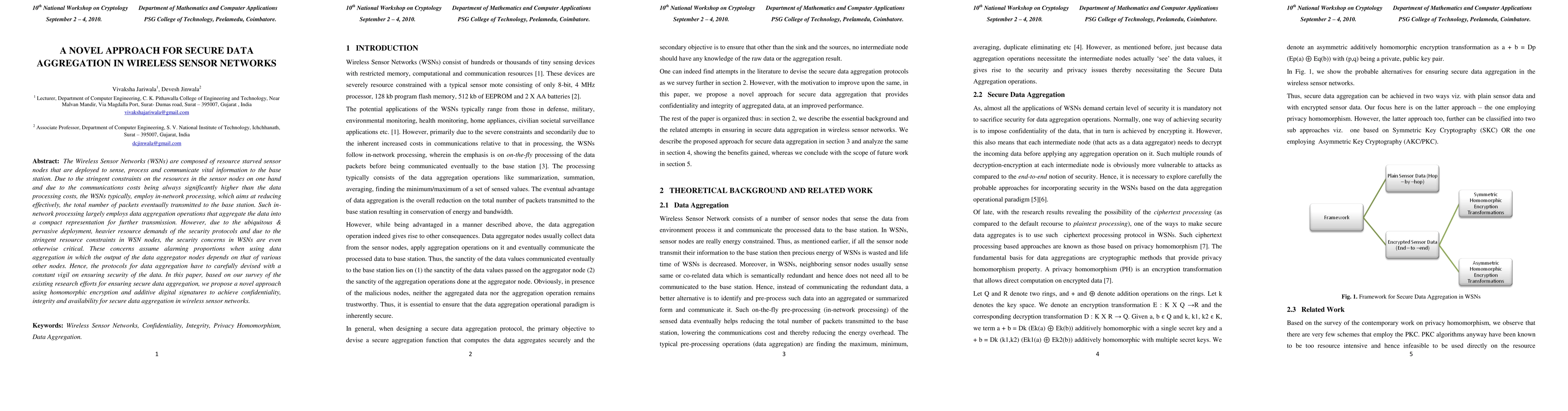 The Wireless Sensor Networks (WSNs) are composed of resource starved sensor nodes that are deployed to sense, process and communicate vital information to the base station. Due to the stringent constraints on the resources in the sensor nodes on one hand and due to the communications costs being always significantly higher than the data processing costs, the WSNs typically, employ in-network processing, which aims at reducing effectively, the total number of packets eventually transmitted to the base station. Such innetwork processing largely employs data aggregation operations that aggregate the data into a compact representation for further transmission. However, due to the ubiquitous & pervasive deployment, heavier resource demands of the security protocols and due to the stringent resource constraints in WSN nodes, the security concerns in WSNs are even otherwise critical. These concerns assume alarming proportions when using data aggregation in which the output of the data aggregator nodes depends on that of various other nodes. Hence, the protocols for data aggregation have to carefully devised with a constant vigil on ensuring security of the data. In this paper, based on our survey of the existing research efforts for ensuring secure data aggregation, we propose a novel approach using homomorphic encryption and additive digital signatures to achieve confidentiality, integrity and availability for secure data aggregation in wireless sensor networks.