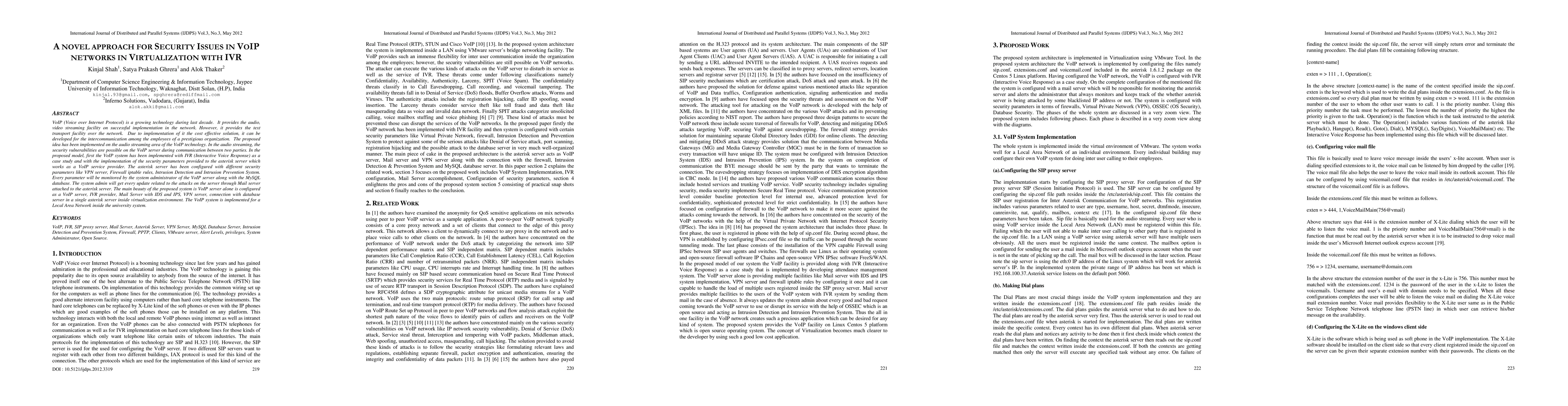 VoIP (Voice over Internet Protocol) is a growing technology during last decade. It provides the audio, video streaming facility on successful implementation in the network. However, it provides the text transport facility over the network. Due to implementation of it the cost effective solution, it can be developed for the intercommunication among the employees of a prestigious organization. The proposed idea has been implemented on the audio streaming area of the VoIP technology. In the audio streaming, the security vulnerabilities are possible on the VoIP server during communication between two parties. In the proposed model, first the VoIP system has been implemented with IVR (Interactive Voice Response) as a case study and with the implementation of the security parameters provided to the asterisk server which works as a VoIP service provider. The asterisk server has been configured with different security parameters like VPN server, Firewall iptable rules, Intrusion Detection and Intrusion Prevention System. Every parameter will be monitored by the system administrator of the VoIP server along with the MySQL database. The system admin will get every update related to the attacks on the server through Mail server attached to the asterisk server. The main beauty of the proposed system is VoIP server alone is configured as a VoIP server, IVR provider, Mail Server with IDS and IPS, VPN server, connection with database server in a single asterisk server inside virtualization environment. The VoIP system is implemented for a Local Area Network inside the university system