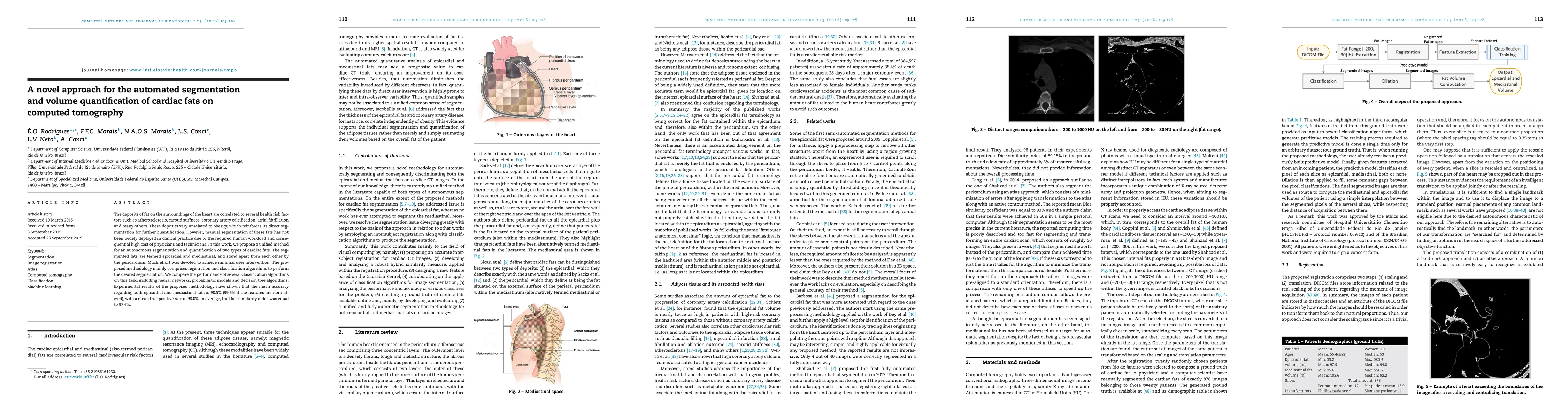This research introduces a novel automated method for segmenting and quantifying two types of heart fats, epicardial and mediastinal, using registration and classification algorithms. The method achieves high accuracy (98.5%) and minimal user intervention, outperforming various classification algorithms, with Dice similarity index at 97.6%.