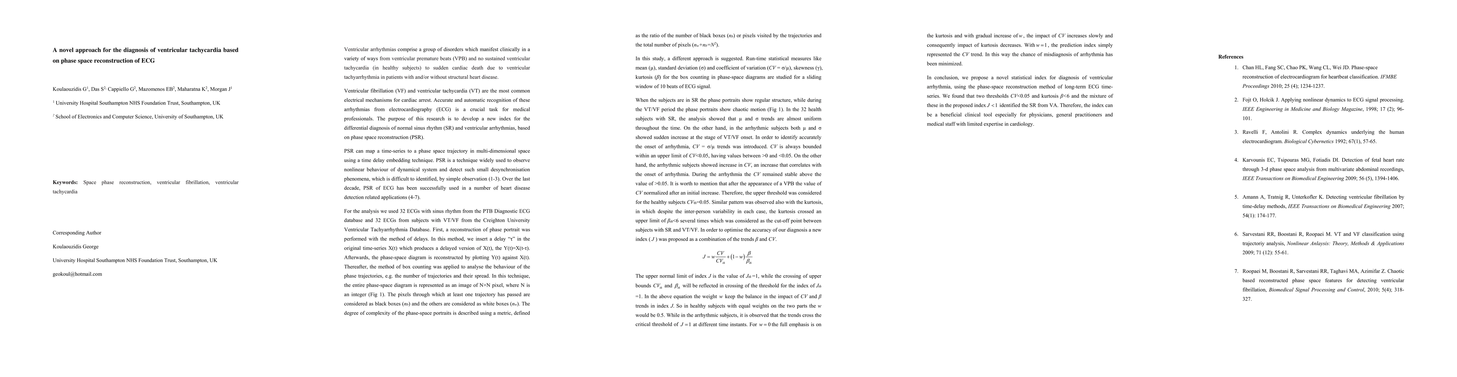 Ventricular arrhythmias comprise a group of disorders which manifest clinically in a variety of ways from ventricular premature beats (VPB) and no sustained ventricular tachycardia (in healthy subjects) to sudden cardiac death due to ventricular tachyarrhythmia in patients with and/or without structural heart disease. Ventricular fibrillation (VF) and ventricular tachycardia (VT) are the most common electrical mechanisms for cardiac arrest. Accurate and automatic recognition of these arrhythmias from electrocardiography (ECG) is a crucial task for medical professionals. The purpose of this research is to develop a new index for the differential diagnosis of normal sinus rhythm (SR) and ventricular arrhythmias, based on phase space reconstruction (PSR).