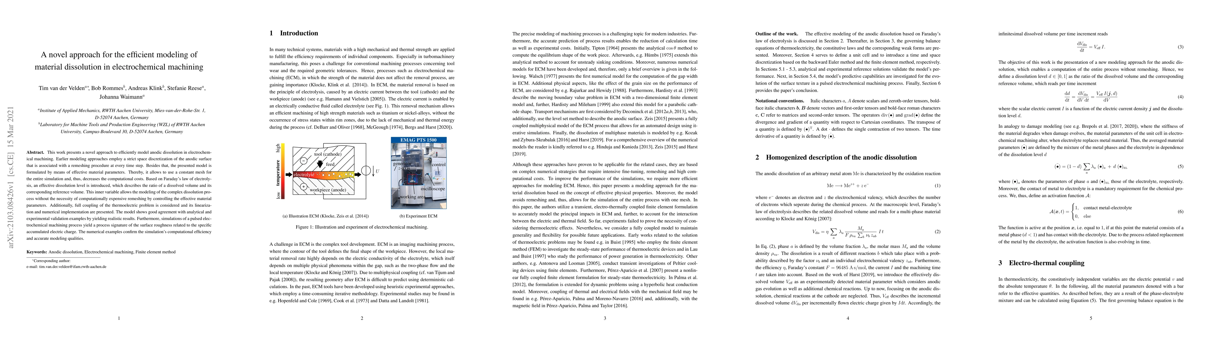 This paper introduces a novel, efficient modeling approach for anodic dissolution in electrochemical machining, utilizing effective material parameters and constant mesh, reducing computational costs. The model, based on Faraday's law, incorporates an effective dissolution level for accurate simulation without remeshing, validated through analytical and experimental comparisons.