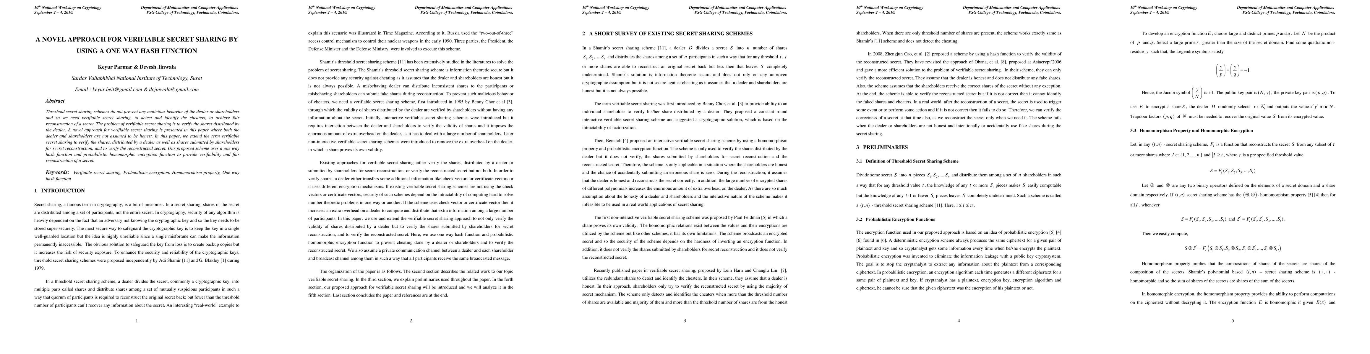 This paper proposes a novel verifiable secret sharing scheme using a one-way hash function and probabilistic homomorphic encryption to detect cheaters and ensure fair secret reconstruction, addressing the lack of trust in traditional threshold secret sharing schemes. The scheme verifies both dealer-distributed shares and shares submitted by shareholders.