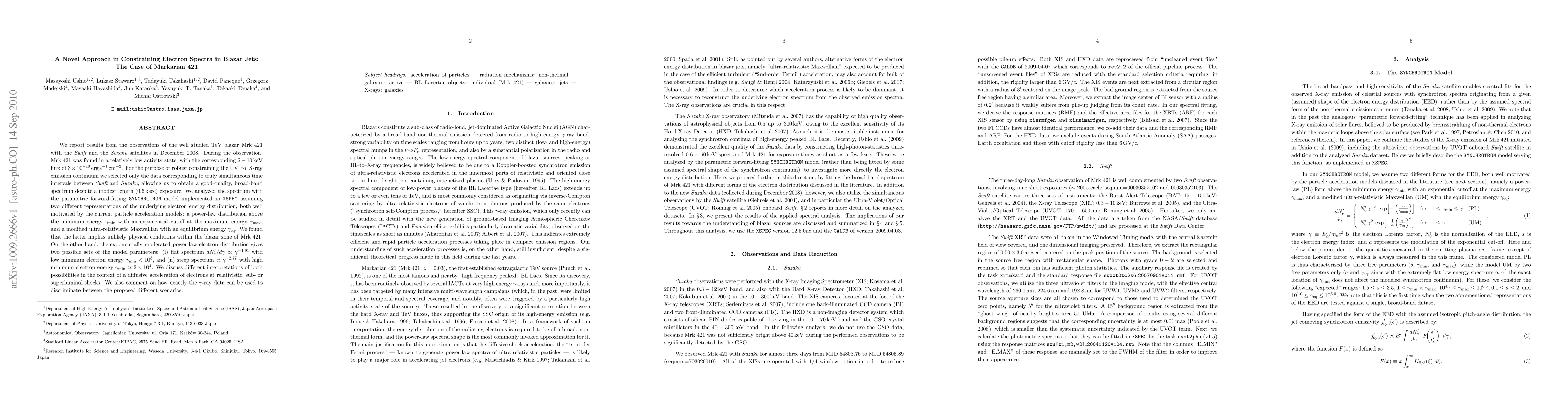 We report results from the observations of the well studied TeV blazar Mrk 421 with the Swift and the Suzaku satellites in December 2008. During the observation, Mrk 421 was found in a relatively low activity state, with the corresponding 2-10 keV flux of $3 \times 10^{-10}$ erg/s/cm^2. For the purpose of robust constraining the UV-to-X-ray emission continuum we selected only the data corresponding to truly simultaneous time intervals between Swift and Suzaku, allowing us to obtain a good-quality, broad-band spectrum despite a modest length (0.6 ksec) exposure. We analyzed the spectrum with the parametric forward-fitting SYNCHROTRON model implemented in XSPEC assuming two different representations of the underlying electron energy distribution, both well motivated by the current particle acceleration models: a power-law distribution above the minimum energy $\gamma_{\rm min}$ with an exponential cutoff at the maximum energy $\gamma_{\rm max}$, and a modified ultra-relativistic Maxwellian with an equilibrium energy $\gamma_{\rm eq}$. We found that the latter implies unlikely physical conditions within the blazar zone of Mrk 421. On the other hand, the exponentially moderated power-law electron distribution gives two possible sets of the model parameters: (i) flat spectrum $dN'_e/d\gamma \propto \gamma^{-1.91}$ with low minimum electron energy $\gamma_{\rm min}<10^3$, and (ii) steep spectrum $\propto \gamma^{-2.77}$ with high minimum electron energy $\gamma_{\rm min}\simeq 2\times10^4$. We discuss different interpretations of both possibilities in the context of a diffusive acceleration of electrons at relativistic, sub- or superluminal shocks. We also comment on how exactly the gamma-ray data can be used to discriminate between the proposed different scenarios.