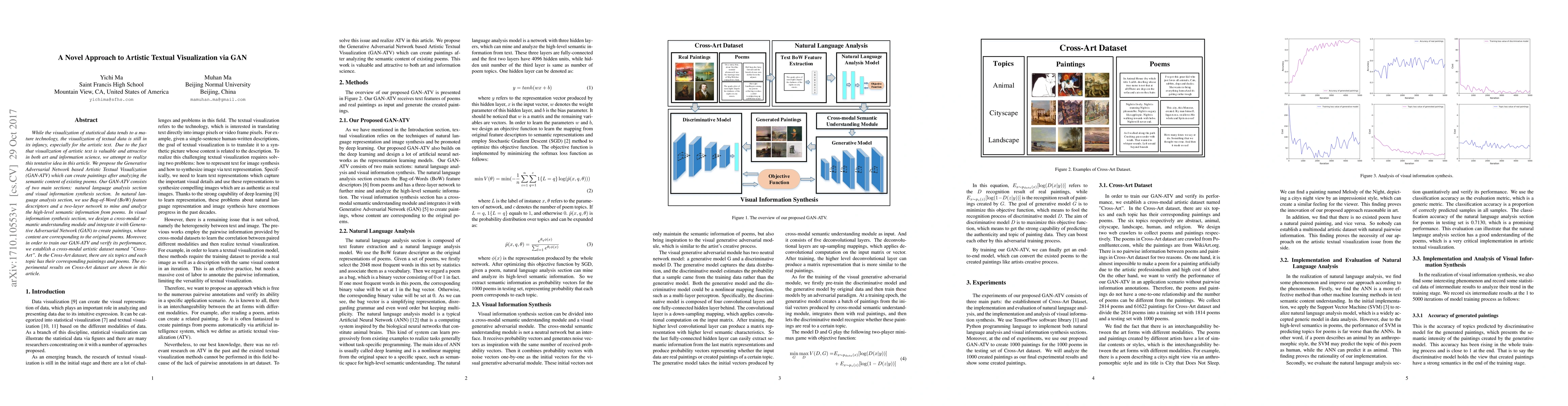 This paper proposes GAN-ATV, a novel Generative Adversarial Network-based approach for artistic textual visualization, which analyzes the semantic content of poems to create corresponding paintings. The method includes natural language analysis and visual synthesis sections, and is trained on a new cross-modal artistic dataset named "Cross-Art."